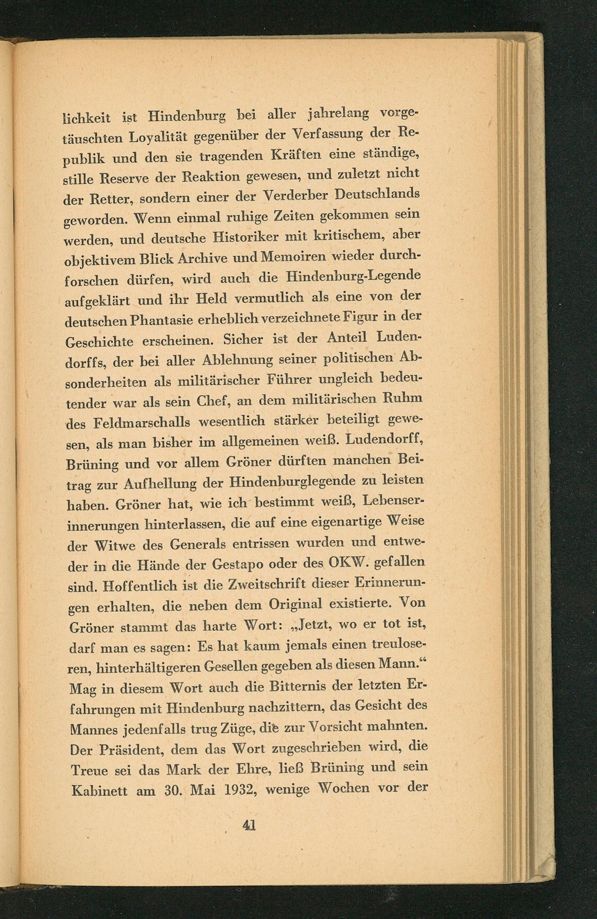lichkeit ist Hindenburg bei aller jahrelang vorgetäuschten Loyalität gegenüber der Verfassung der Republik und den sie tragenden Kräften eine ständige, stille Reserve der Reaktion gewesen, und zuletzt nicht der Retter, sondern einer der Verderber Deutschlands geworden. Wenn einmal ruhige Zeiten gekommen sein werden, und deutsche Historiker mit kritischem, aber objektivem Blick Archive und Memoiren wieder durchforschen dürfen, wird auch die Hindenburg - Legende aufgeklärt und ihr Held vermutlich als eine von der deutschen Phantasie erheblich verzeichnete Figur in der Geschichte erscheinen. Sicher ist der Anteil Ludendorffs, der bei aller Ablehnung seiner politischen Absonderheiten als militärischer Führer ungleich bedeutender war als sein Chef, an dem militärischen Ruhm des Feldmarschalls wesentlich stärker beteiligt gewesen, als man bisher im allgemeinen weiß. Ludendorff , Brüning und vor allem Gröner dürften manchen Beitrag zur Aufhellung der Hindenburglegende zu leisten haben. Gröner hat, wie ich bestimmt weiß, Lebenserinnerungen hinterlassen, die auf eine eigenartige Weise der Witwe des Generals entrissen wurden und entweder in die Hände der Gestapo oder des OKW. gefallen sind. Hoffentlich ist die Zweitschrift dieser Erinnerungen erhalten, die neben dem Original existierte. Von Gröner stammt das harte Wort: ,, Jetzt, wo er tot ist, darf man es sagen: Es hat kaum jemals einen treuloseren, hinterhältigeren Gesellen gegeben als diesen Mann." Mag in diesem Wort auch die Bitternis der letzten Erfahrungen mit Hindenburg nachzittern, das Gesicht des Mannes jedenfalls trug Züge, die zur Vorsicht mahnten. Der Präsident, dem das Wort zugeschrieben wird, die Treue sei das Mark der Ehre, ließ Brüning und sein Kabinett am 30. Mai 1932, wenige Wochen vor der