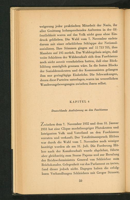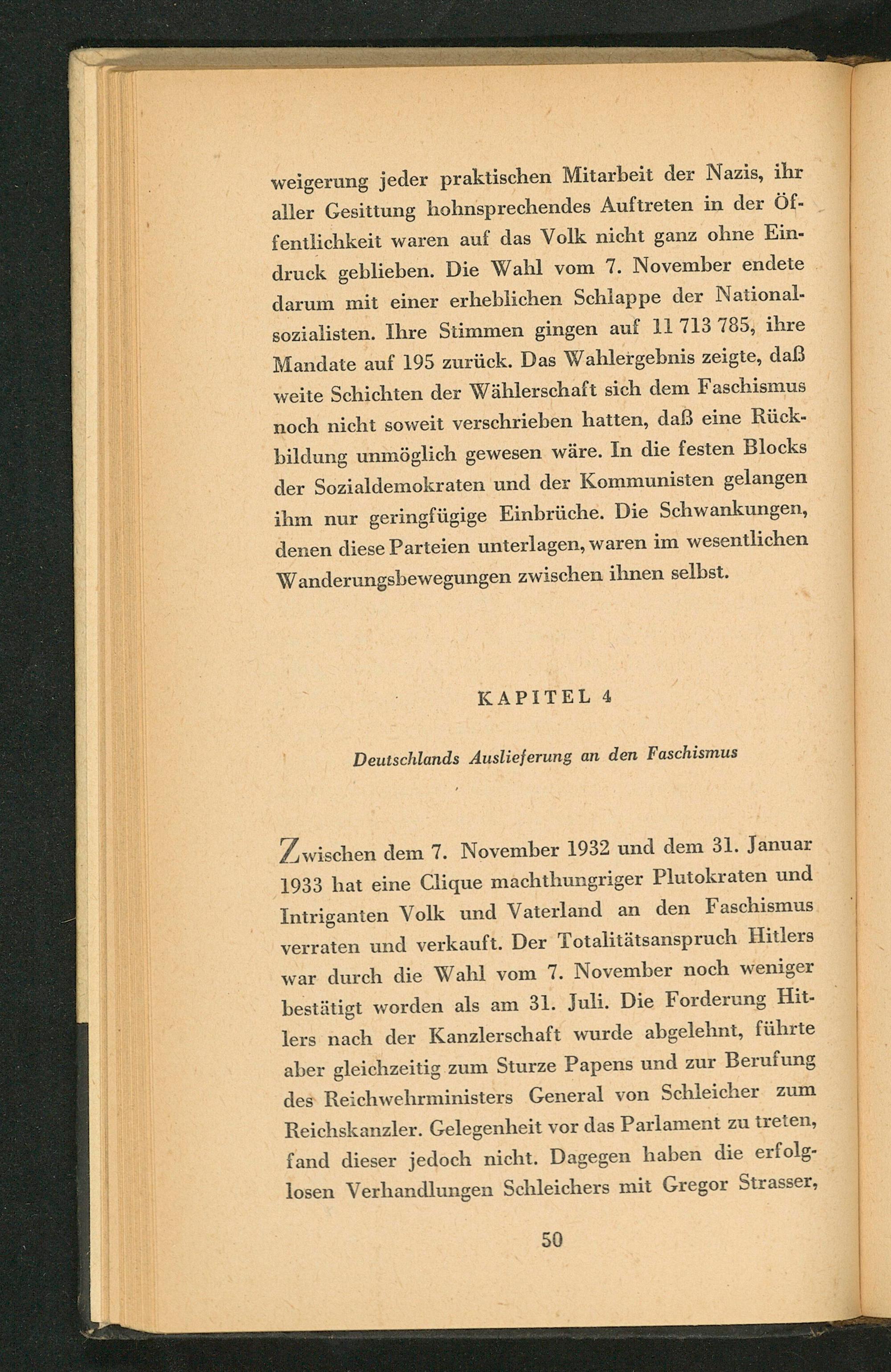 Zwischen dem 7. November 1932 und dem 31. Januar 1933 hat eine Clique machthungriger Plutokraten und Intriganten Volk und Vaterland an den Faschismus verraten und verkauft. Der Totalitätsanspruch Hitlers war durch die Wahl vom 7. November noch weniger bestätigt worden als am 31. Juli. Die Forderung Hitlers nach der Kanzlerschaft wurde abgelehnt, führte aber gleichzeitig zum Sturze Papens und zur Berufung des Reichwehrministers General von Schleicher zum Reichskanzler. Gelegenheit vor das Parlament zu treten, fand dieser jedoch nicht. Dagegen haben die erfolglosen Verhandlungen Schleichers mit Gregor Strasser ,