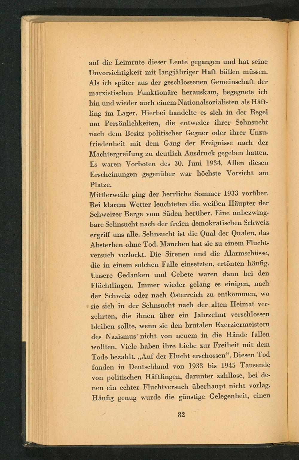 Mittlerweile ging der herrliche Sommer 1933 vorüber. Bei klarem Wetter leuchteten die weißen Häupter der Schweizer Berge vom Süden herüber. Eine unbezwingbare Sehnsucht nach der freien demokratischen Schweiz ergriff uns alle. Sehnsucht ist die Qual der Qualen, das Absterben ohne Tod. Manchen hat sie zu einem Fluchtversuch verlockt. Die Sirenen und die Alarmschüsse, die in einem solchen Falle einsetzten, ertönten häufig. Unsere Gedanken und Gebete waren dann bei den Flüchtlingen. Immer wieder gelang es einigen, nach der Schweiz oder nach Österreich zu entkommen, wo sie sich in der Sehnsucht nach der alten Heimat verzehrten, die ihnen über ein Jahrzehnt verschlossen bleiben sollte, wenn sie den brutalen Exerziermeistern des Nazismus' nicht von neuem in die Hände fallen wollten. Viele haben ihre Liebe zur Freiheit mit dem Tode bezahlt. ,, Auf der Flucht erschossen". Diesen Tod fanden in Deutschland von 1933 bis 1945 Tausende von politischen Häftlingen, darunter zahllose, bei denen ein echter Fluchtversuch überhaupt nicht vorlag. Häufig genug wurde die günstige Gelegenheit, einen