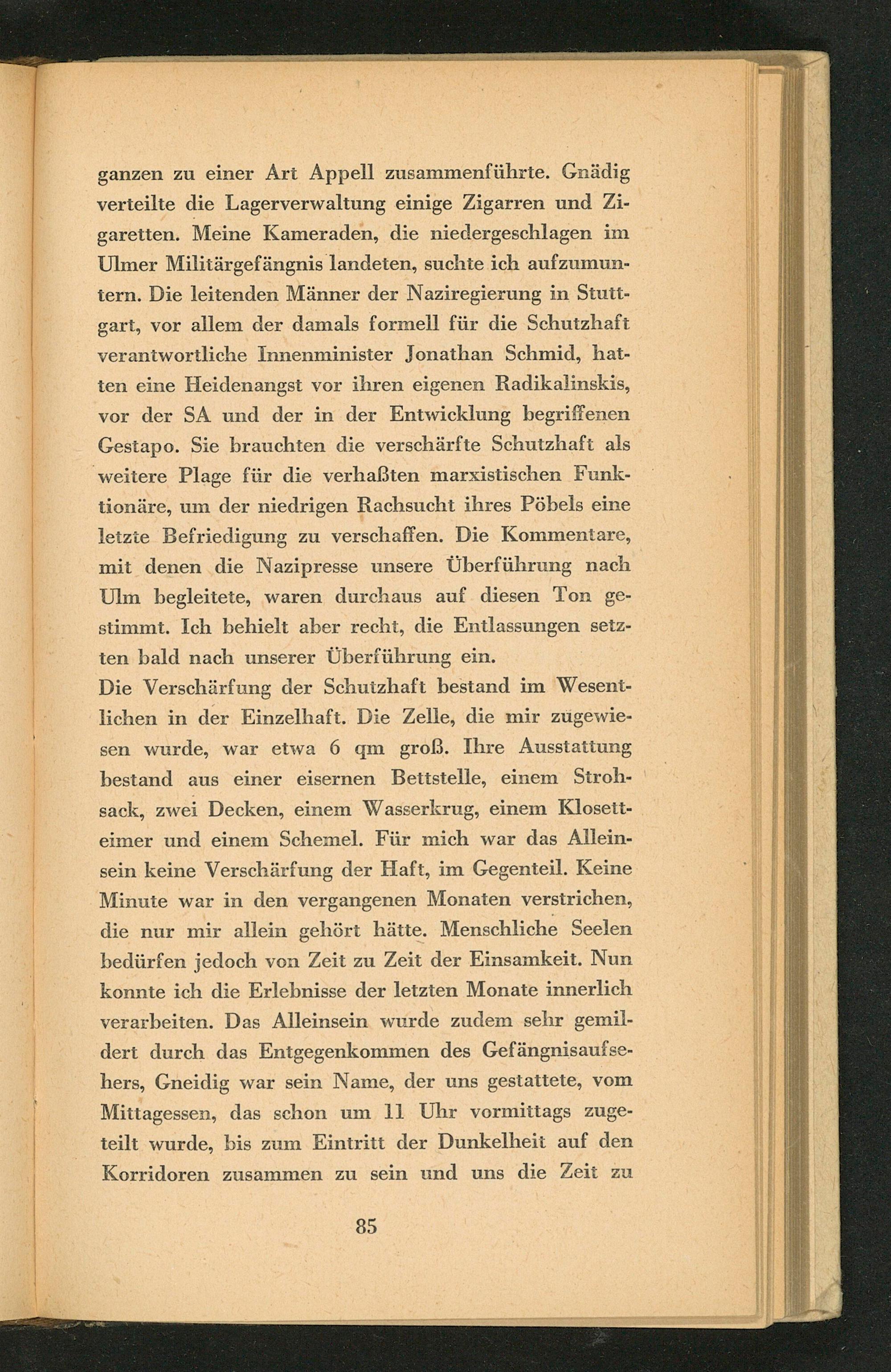 ganzen zu einer Art Appell zusammenführte. Gnädig verteilte die Lagerverwaltung einige Zigarren und Zigaretten. Meine Kameraden, die niedergeschlagen im Ulmer Militärgefängnis landeten, suchte ich aufzumuntern. Die leitenden Männer der Naziregierung in Stuttgart , vor allem der damals formell für die Schutzhaft verantwortliche Innenminister Jonathan Schmid, hatten eine Heidenangst vor ihren eigenen Radikalinskis, vor der SA und der in der Entwicklung begriffenen Gestapo . Sie brauchten die verschärfte Schutzhaft als weitere Plage für die verhaßten marxistischen Funktionäre, um der niedrigen Rachsucht ihres Pöbels eine letzte Befriedigung zu verschaffen. Die Kommentare, mit denen die Nazipresse unsere Überführung nach Ulm begleitete, waren durchaus auf diesen Ton gestimmt. Ich behielt aber recht, die Entlassungen setzten bald nach unserer Überführung ein.