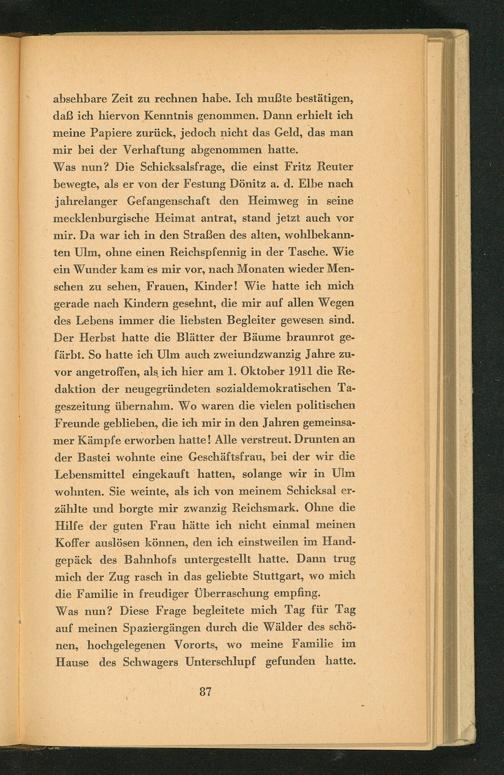 absehbare Zeit zu rechnen habe. Ich mußte bestätigen, daß ich hiervon Kenntnis genommen. Dann erhielt ich meine Papiere zurück, jedoch nicht das Geld, das man mir bei der Verhaftung abgenommen hatte. Was nun? Die Schicksalsfrage, die einst Fritz Reuter bewegte, als er von der Festung Dönitz a. d. Elbe nach jahrelanger Gefangenschaft den Heimweg in seine mecklenburgische Heimat antrat, stand jetzt auch vor mir. Da war ich in den Straßen des alten, wohlbekannten Ulm , ohne einen Reichspfennig in der Tasche. Wie ein Wunder kam es mir vor, nach Monaten wieder Menschen zu sehen, Frauen, Kinder! Wie hatte ich mich gerade nach Kindern gesehnt, die mir auf allen Wegen des Lebens immer die liebsten Begleiter gewesen sind. Der Herbst hatte die Blätter der Bäume braunrot gefärbt. So hatte ich Ulm auch zweiundzwanzig Jahre zuvor angetroffen, als ich hier am 1. Oktober 1911 die Redaktion der neugegründeten sozialdemokratischen Tageszeitung übernahm. Wo waren die vielen politischen Freunde geblieben, die ich mir in den Jahren gemeinsamer Kämpfe erworben hatte! Alle verstreut. Drunten an der Bastei wohnte eine Geschäftsfrau, bei der wir die Lebensmittel eingekauft hatten, solange wir in Ulm wohnten. Sie weinte, als ich von meinem Schicksal erzählte und borgte mir zwanzig Reichsmark. Ohne die Hilfe der guten Frau hätte ich nicht einmal meinen Koffer auslösen können, den ich einstweilen im Handgepäck des Bahnhofs untergestellt hatte. Dann trug mich der Zug rasch in das geliebte Stuttgart , wo mich die Familie in freudiger Überraschung empfing. Was nun? Diese Frage begleitete mich Tag für Tag auf meinen Spaziergängen durch die Wälder des schönen, hochgelegenen Vororts, wo meine Familie im Hause des Schwagers Unterschlupf gefunden hatte.
