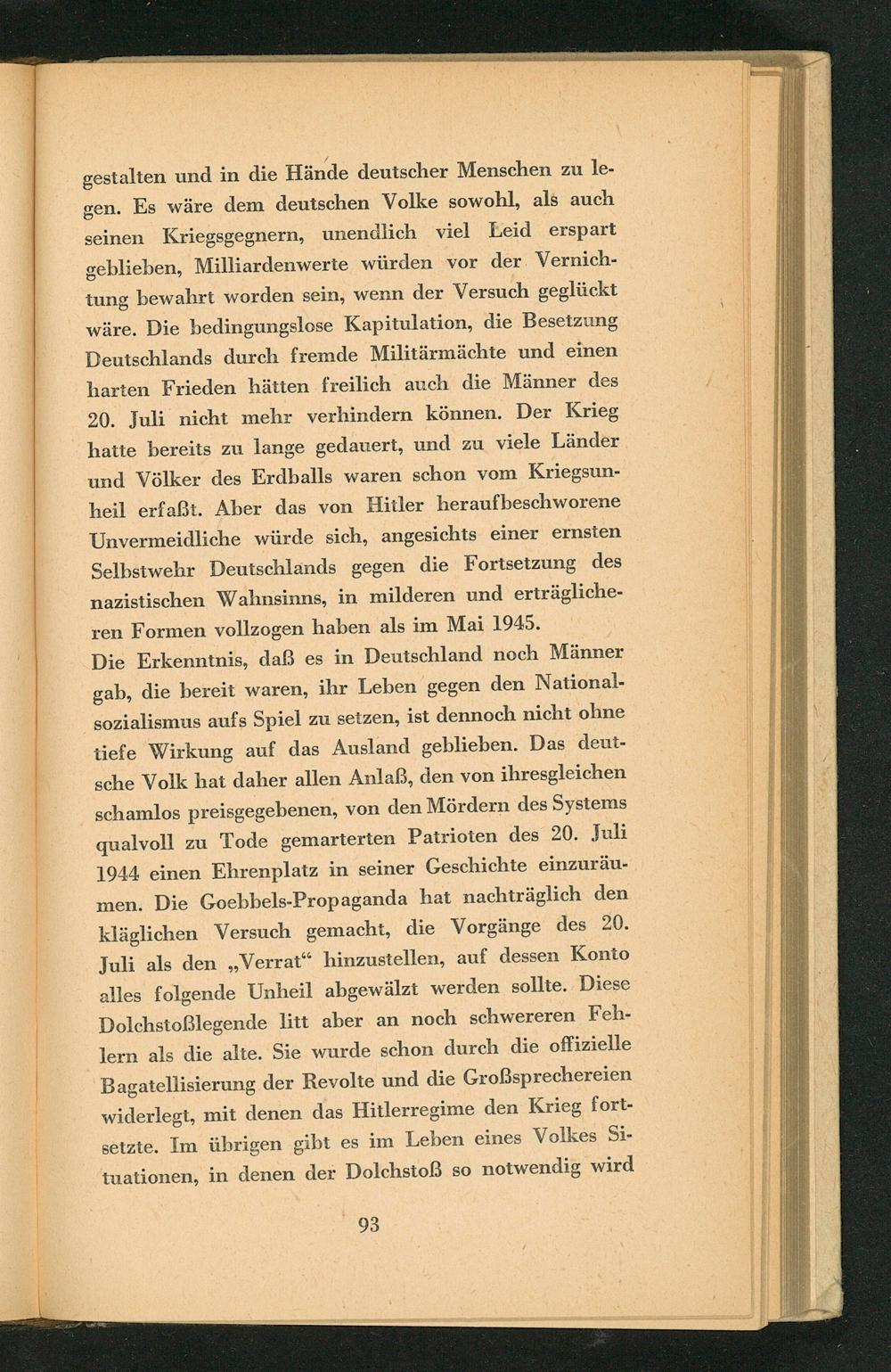 Die Erkenntnis, daß es in Deutschland noch Männer gab, die bereit waren, ihr Leben gegen den Nationalsozialismus aufs Spiel zu setzen, ist dennoch nicht ohne tiefe Wirkung auf das Ausland geblieben. Das deutsche Volk hat daher allen Anlaß, den von ihresgleichen schamlos preisgegebenen, von den Mördern des Systems qualvoll zu Tode gemarterten Patrioten des 20. Juli 1944 einen Ehrenplatz in seiner Geschichte einzuräumen. Die Goebbels- Propaganda hat nachträglich den kläglichen Versuch gemacht, die Vorgänge des 20. Juli als den ,, Verrat" hinzustellen, auf dessen Konto alles folgende Unheil abgewälzt werden sollte. Diese Dolchstoẞlegende litt aber an noch schwereren Fehlern als die alte. Sie wurde schon durch die offizielle Bagatellisierung der Revolte und die Großsprechereien widerlegt, mit denen das Hitlerregime den Krieg fortsetzte. Im übrigen gibt es im Leben eines Volkes Situationen, in denen der Dolchstoẞ so notwendig wird