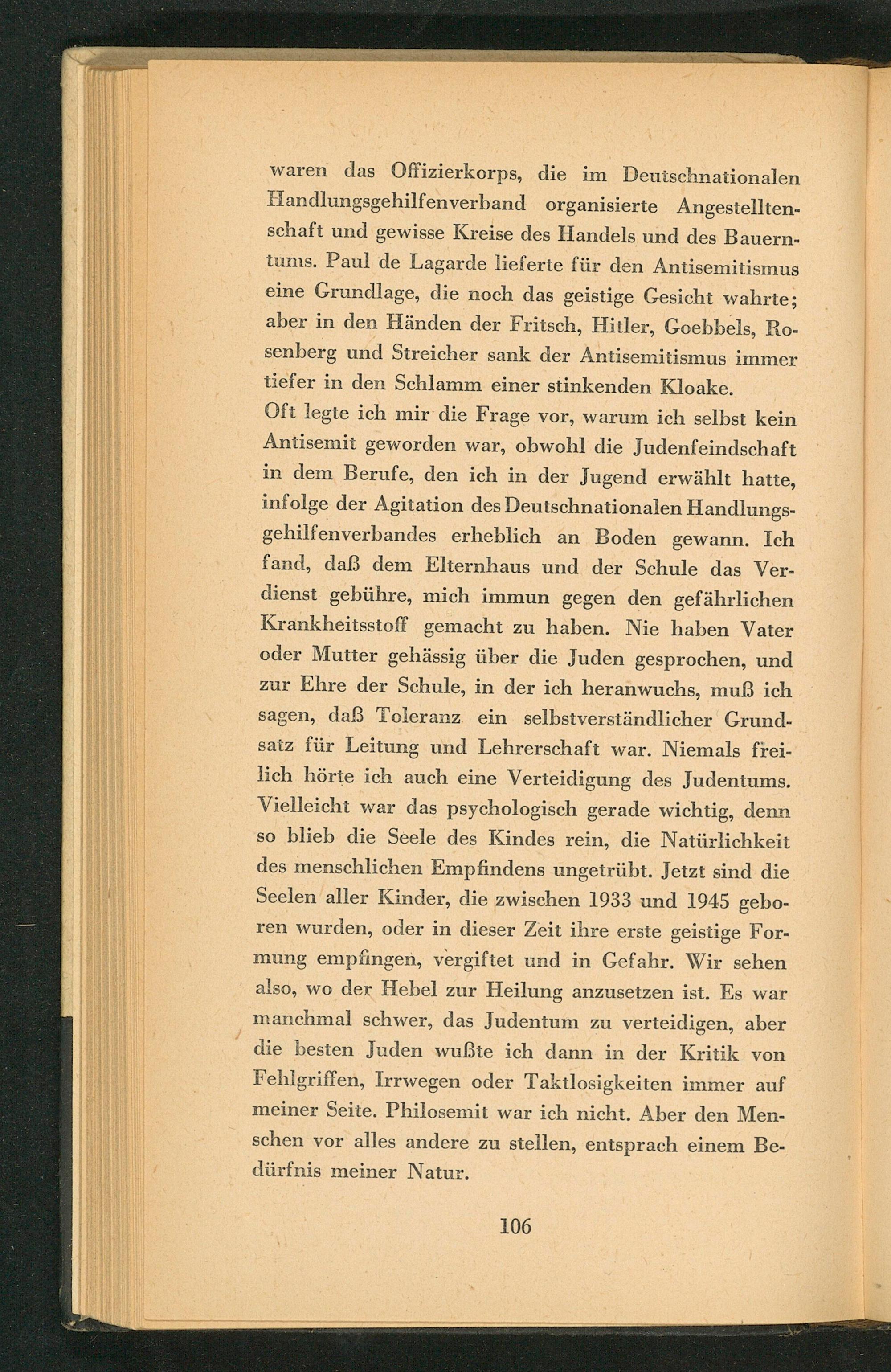 waren das Offizierkorps, die im Deutschnationalen Handlungsgehilfenverband organisierte Angestelltenschaft und gewisse Kreise des Handels und des Bauerntums. Paul de Lagarde lieferte für den Antisemitismus eine Grundlage, die noch das geistige Gesicht wahrte; aber in den Händen der Fritsch, Hitler, Goebbels , Rosenberg und Streicher sank der Antisemitismus immer tiefer in den Schlamm einer stinkenden Kloake.