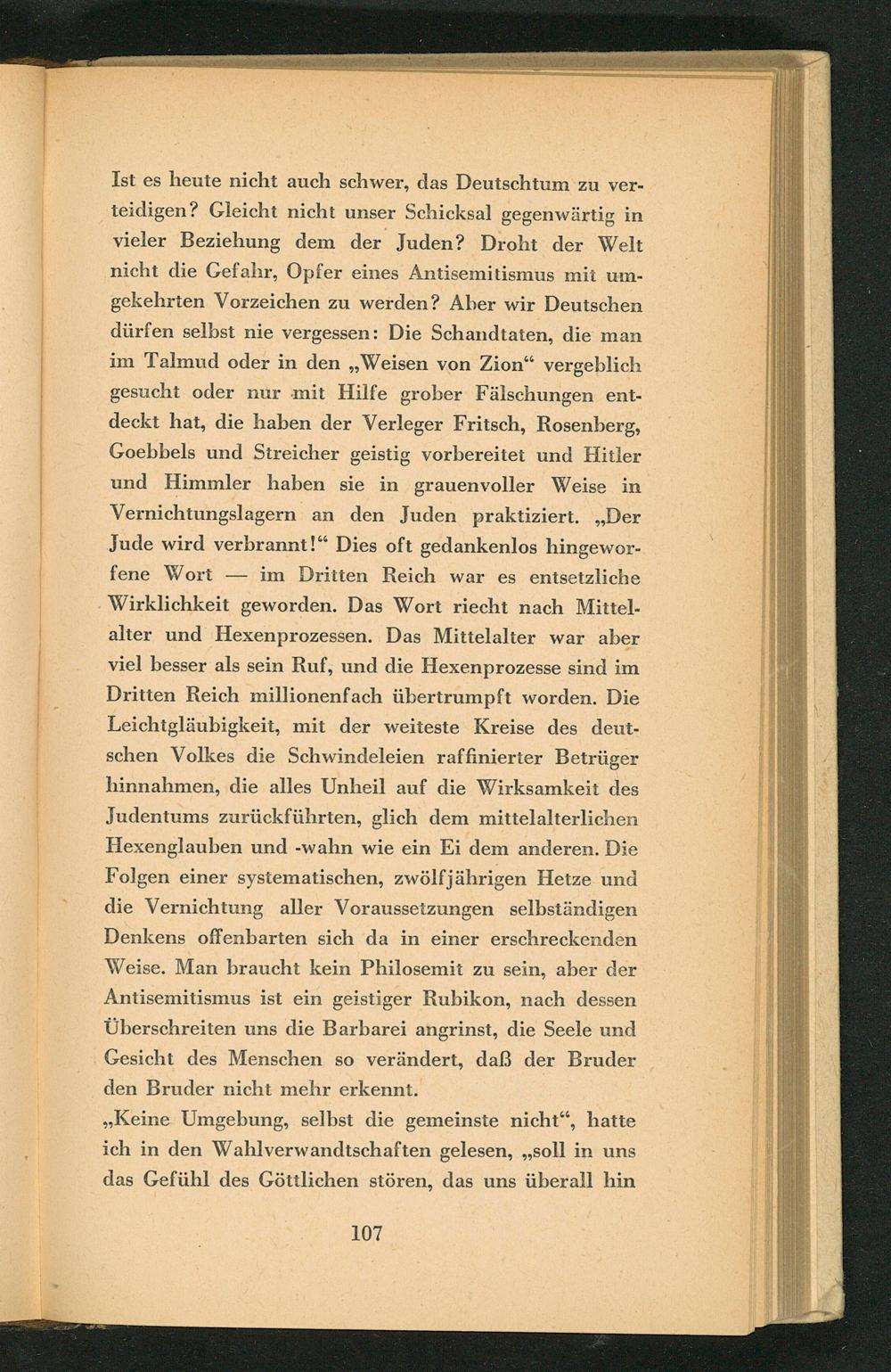 Ist es heute nicht auch schwer, das Deutschtum zu verteidigen? Gleicht nicht unser Schicksal gegenwärtig in vieler Beziehung dem der Juden? Droht der Welt nicht die Gefahr, Opfer eines Antisemitismus mit umgekehrten Vorzeichen zu werden? Aber wir Deutschen dürfen selbst nie vergessen: Die Schandtaten, die man im Talmud oder in den ,, Weisen von Zion " vergeblich gesucht oder nur mit Hilfe grober Fälschungen entdeckt hat, die haben der Verleger Fritsch, Rosenberg, Goebbels und Streicher geistig vorbereitet und Hitler und Himmler haben sie in grauenvoller Weise in Vernichtungslagern an den Juden praktiziert.„, Der Jude wird verbrannt!" Dies oft gedankenlos hingewor-. fene Wort im Dritten Reich war es entsetzliche Wirklichkeit geworden. Das Wort riecht nach Mittelalter und Hexenprozessen. Das Mittelalter war aber viel besser als sein Ruf, und die Hexenprozesse sind im Dritten Reich millionenfach übertrumpft worden. Die Leichtgläubigkeit, mit der weiteste Kreise des deutschen Volkes die Schwindeleien raffinierter Betrüger hinnahmen, die alles Unheil auf die Wirksamkeit des Judentums zurückführten, glich dem mittelalterlichen Hexenglauben und-wahn wie ein Ei dem anderen. Die Folgen einer systematischen, zwölfjährigen Hetze und die Vernichtung aller Voraussetzungen selbständigen Denkens offenbarten sich da in einer erschreckenden Weise. Man braucht kein Philosemit zu sein, aber der Antisemitismus ist ein geistiger Rubikon, nach dessen Überschreiten uns die Barbarei angrinst, die Seele und Gesicht des Menschen so verändert, daß der Bruder den Bruder nicht mehr erkennt.
