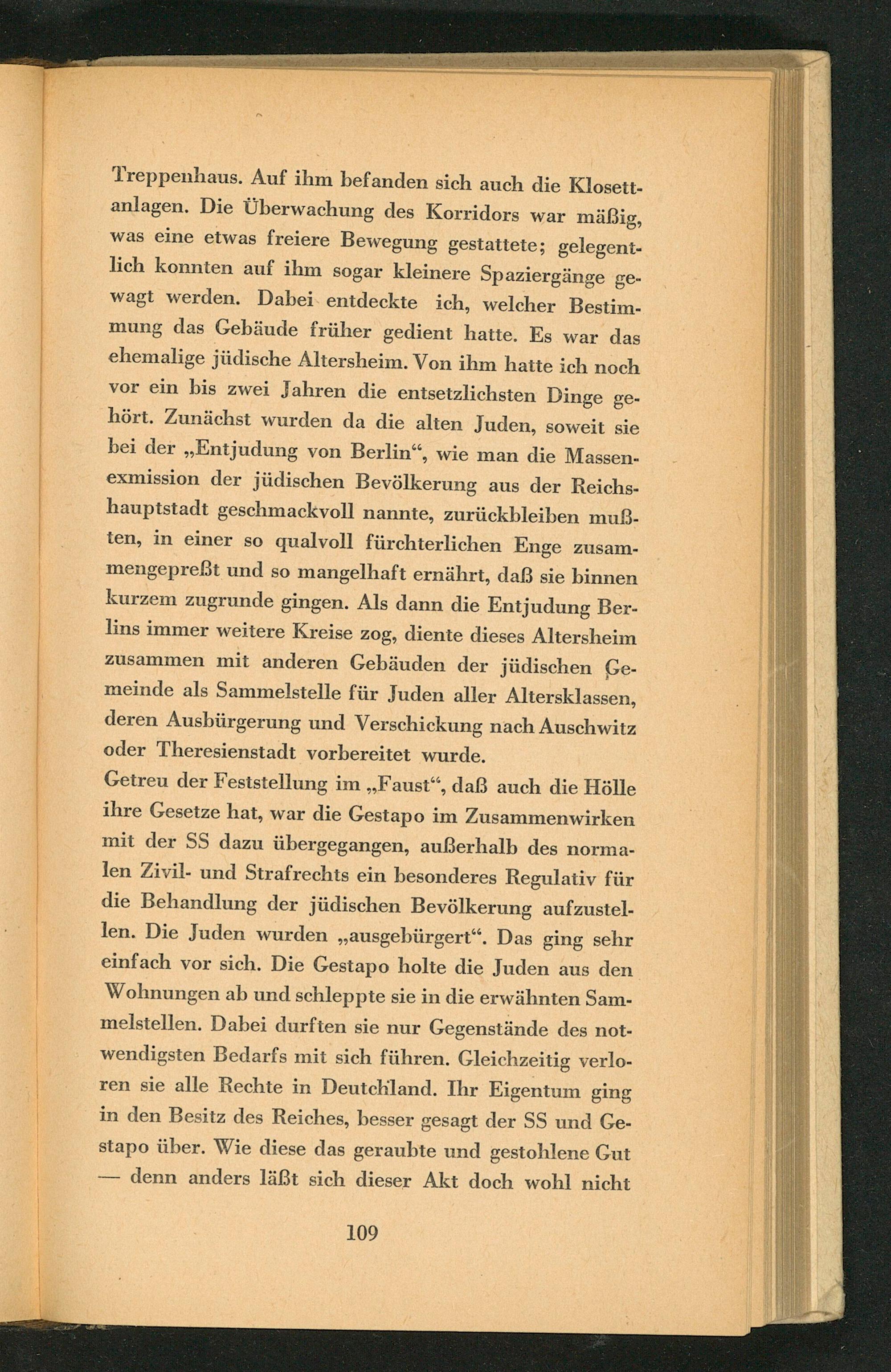 Treppenhaus. Auf ihm befanden sich auch die Klosettanlagen. Die Überwachung des Korridors war mäßig, was eine etwas freiere Bewegung gestattete; gelegentlich konnten auf ihm sogar kleinere Spaziergänge gewagt werden. Dabei entdeckte ich, welcher Bestimmung das Gebäude früher gedient hatte. Es war das ehemalige jüdische Altersheim. Von ihm hatte ich noch vor ein bis zwei Jahren die entsetzlichsten Dinge gehört. Zunächst wurden da die alten Juden, soweit sie bei der„, Entjudung von Berlin ", wie man die Massenexmission der jüdischen Bevölkerung aus der Reichshauptstadt geschmackvoll nannte, zurückbleiben muẞten, in einer so qualvoll fürchterlichen Enge zusammengepreßt und so mangelhaft ernährt, daß sie binnen kurzem zugrunde gingen. Als dann die Entjudung Berlins immer weitere Kreise zog, diente dieses Altersheim zusammen mit anderen Gebäuden der jüdischen Gemeinde als Sammelstelle für Juden aller Altersklassen, deren Ausbürgerung und Verschickung nach Auschwitz oder Theresienstadt vorbereitet wurde.