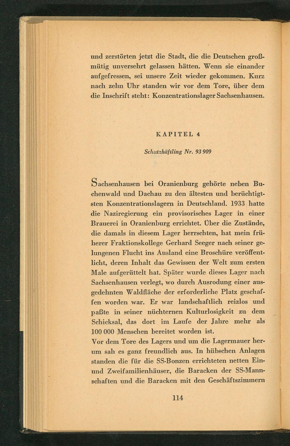 Sachsenhausen bei Oranienburg gehörte neben Buchenwald und Dachau zu den ältesten und berüchtigtsten Konzentrationslagern in Deutschland . 1933 hatte die Naziregierung ein provisorisches Lager in einer Brauerei in Oranienburg errichtet. Über die Zustände, die damals in diesem Lager herrschten, hat mein früherer Fraktionskollege Gerhard Seeger nach seiner gelungenen Flucht ins Ausland eine Broschüre veröffentlicht, deren Inhalt das Gewissen der Welt zum ersten Male aufgerüttelt hat. Später wurde dieses Lager nach Sachsenhausen verlegt, wo durch Ausrodung einer ausgedehnten Waldfläche der erforderliche Platz geschaffen worden war. Er war landschaftlich reizlos und paẞte in seiner nüchternen Kulturlosigkeit zu dem Schicksal, das dort im Laufe der Jahre mehr als 100 000 Menschen bereitet worden ist.