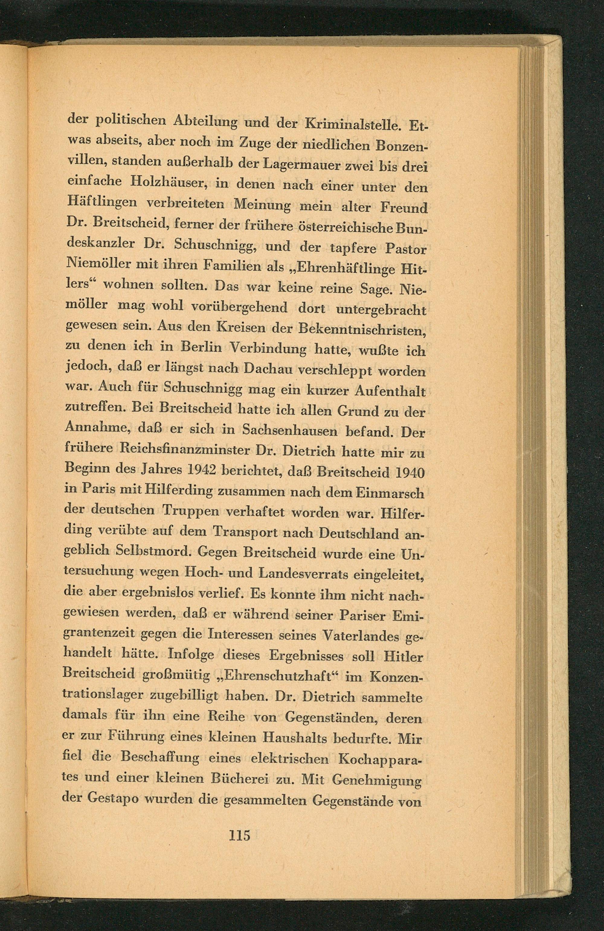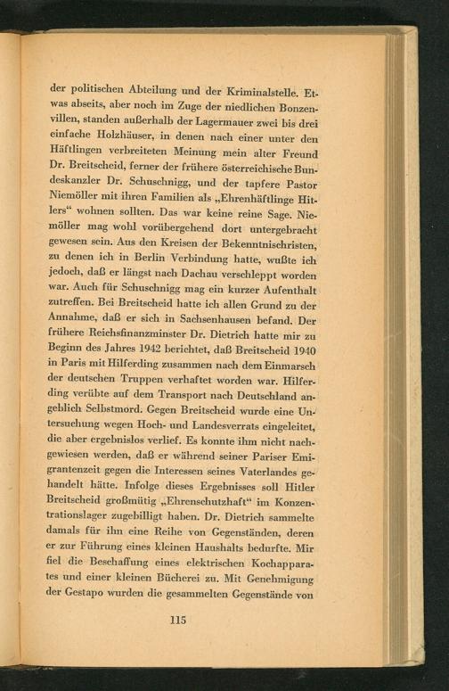 der politischen Abteilung und der Kriminalstelle. Etwas abseits, aber noch im Zuge der niedlichen Bonzenvillen, standen außerhalb der Lagermauer zwei bis drei einfache Holzhäuser, in denen nach einer unter den Häftlingen verbreiteten Meinung mein alter Freund Dr. Breitscheid, ferner der frühere österreichische Bundeskanzler Dr. Schuschnigg , und der tapfere Pastor Niemöller mit ihren Familien als ,, Ehrenhäftlinge Hitlers" wohnen sollten. Das war keine reine Sage. Niemöller mag wohl vorübergehend dort untergebracht gewesen sein. Aus den Kreisen der Bekenntnischristen, zu denen ich in Berlin Verbindung hatte, wußte ich jedoch, daß er längst nach Dachau verschleppt worden war. Auch für Schuschnigg mag ein kurzer Aufenthalt zutreffen. Bei Breitscheid hatte ich allen Grund zu der Annahme, daß er sich in Sachsenhausen befand. Der frühere Reichsfinanzminster Dr. Dietrich hatte mir zu Beginn des Jahres 1942 berichtet, daß Breitscheid 1940 in Paris mit Hilferding zusammen nach dem Einmarsch der deutschen Truppen verhaftet worden war. Hilferding verübte auf dem Transport nach Deutschland angeblich Selbstmord. Gegen Breitscheid wurde eine Untersuchung wegen Hoch- und Landesverrats eingeleitet, die aber ergebnislos verlief. Es konnte ihm nicht nachgewiesen werden, daß er während seiner Pariser Emigrantenzeit gegen die Interessen seines Vaterlandes gehandelt hätte. Infolge dieses Ergebnisses soll Hitler Breitscheid großmütig ,, Ehrenschutzhaft" im Konzentrationslager zugebilligt haben. Dr. Dietrich sammelte damals für ihn eine Reihe von Gegenständen, deren er zur Führung eines kleinen Haushalts bedurfte. Mir fiel die Beschaffung eines elektrischen Kochapparates und einer kleinen Bücherei zu. Mit Genehmigung der Gestapo wurden die gesammelten Gegenstände von