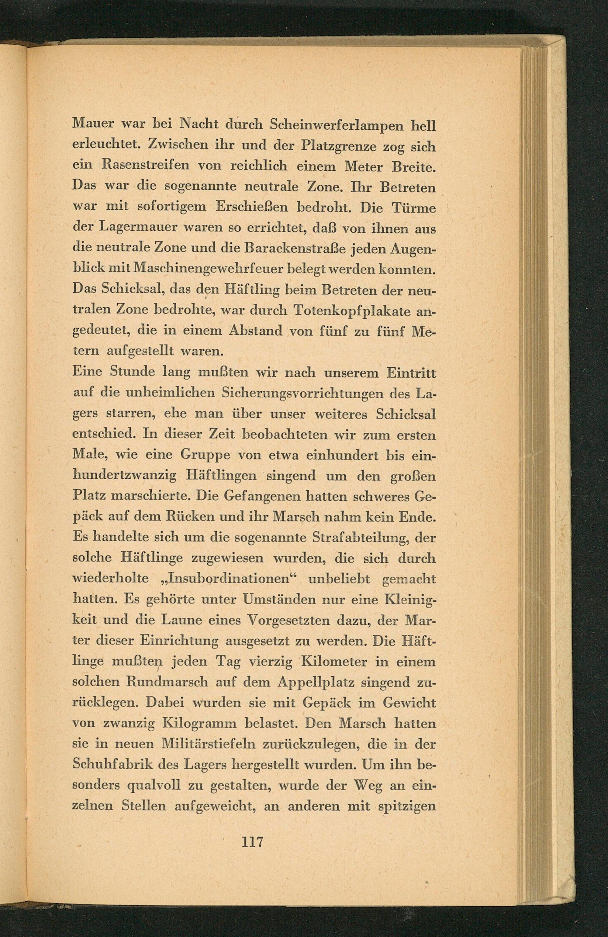 Eine Stunde lang mußten wir nach unserem Eintritt auf die unheimlichen Sicherungsvorrichtungen des Lagers starren, ehe man über unser weiteres Schicksal entschied. In dieser Zeit beobachteten wir zum ersten Male, wie eine Gruppe von etwa einhundert bis einhundertzwanzig Häftlingen singend um den großen Platz marschierte. Die Gefangenen hatten schweres Gepäck auf dem Rücken und ihr Marsch nahm kein Ende. Es handelte sich um die sogenannte Strafabteilung, der solche Häftlinge zugewiesen wurden, die sich durch wiederholte ,, Insubordinationen" unbeliebt gemacht hatten. Es gehörte unter Umständen nur eine Kleinigkeit und die Laune eines Vorgesetzten dazu, der Marter dieser Einrichtung ausgesetzt zu werden. Die Häftlinge mußten jeden Tag vierzig Kilometer in einem solchen Rundmarsch auf dem Appellplatz singend zurücklegen. Dabei wurden sie mit Gepäck im Gewicht von zwanzig Kilogramm belastet. Den Marsch hatten sie in neuen Militärstiefeln zurückzulegen, die in der Schuhfabrik des Lagers hergestellt wurden. Um ihn besonders qualvoll zu gestalten, wurde der Weg an einzelnen Stellen aufgeweicht, an anderen mit spitzigen
