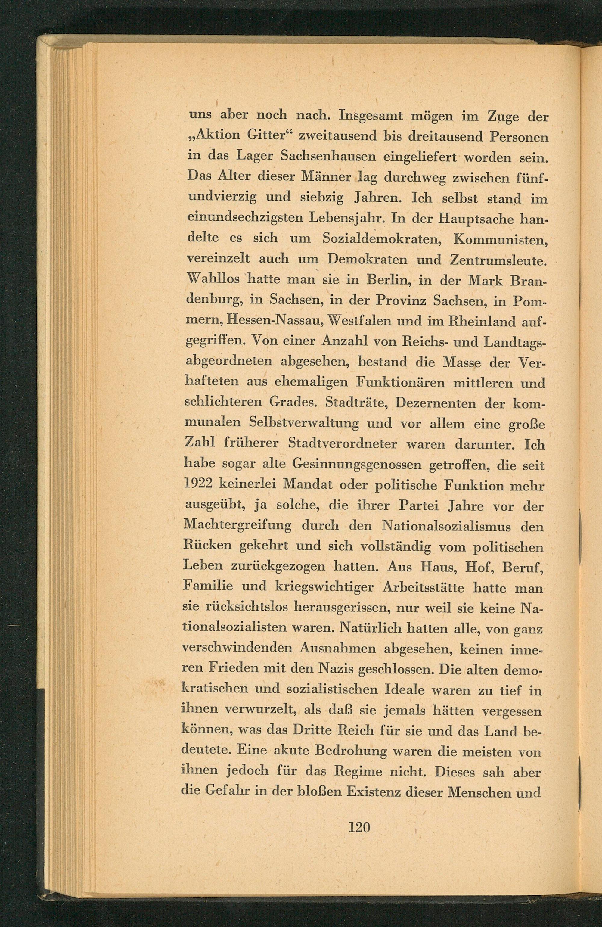 uns aber noch nach. Insgesamt mögen im Zuge der ,, Aktion Gitter" zweitausend bis dreitausend Personen in das Lager Sachsenhausen eingeliefert worden sein. Das Alter dieser Männer lag durchweg zwischen fünfundvierzig und siebzig Jahren. Ich selbst stand im einundsechzigsten Lebensjahr. In der Hauptsache handelte es sich um Sozialdemokraten, Kommunisten, vereinzelt auch um Demokraten und Zentrumsleute. Wahllos hatte man sie in Berlin , in der Mark Brandenburg, in Sachsen, in der Provinz Sachsen, in Pommern, Hessen- Nassau , Westfalen und im Rheinland aufgegriffen. Von einer Anzahl von Reichs- und Landtagsabgeordneten abgesehen, bestand die Masse der Verhafteten aus ehemaligen Funktionären mittleren und schlichteren Grades. Stadträte, Dezernenten der kommunalen Selbstverwaltung und vor allem eine große Zahl früherer Stadtverordneter waren darunter. Ich habe sogar alte Gesinnungsgenossen getroffen, die seit 1922 keinerlei Mandat oder politische Funktion mehr ausgeübt, ja solche, die ihrer Partei Jahre vor der Machtergreifung durch den Nationalsozialismus den Rücken gekehrt und sich vollständig vom politischen Leben zurückgezogen hatten. Aus Haus, Hof, Beruf, Familie und kriegswichtiger Arbeitsstätte hatte man sie rücksichtslos herausgerissen, nur weil sie keine Nationalsozialisten waren. Natürlich hatten alle, von ganz verschwindenden Ausnahmen abgesehen, keinen inneren Frieden mit den Nazis geschlossen. Die alten demokratischen und sozialistischen Ideale waren zu tief in ihnen verwurzelt, als daß sie jemals hätten vergessen können, was das Dritte Reich für sie und das Land bedeutete. Eine akute Bedrohung waren die meisten von ihnen jedoch für das Regime nicht. Dieses sah aber die Gefahr in der bloßen Existenz dieser Menschen und