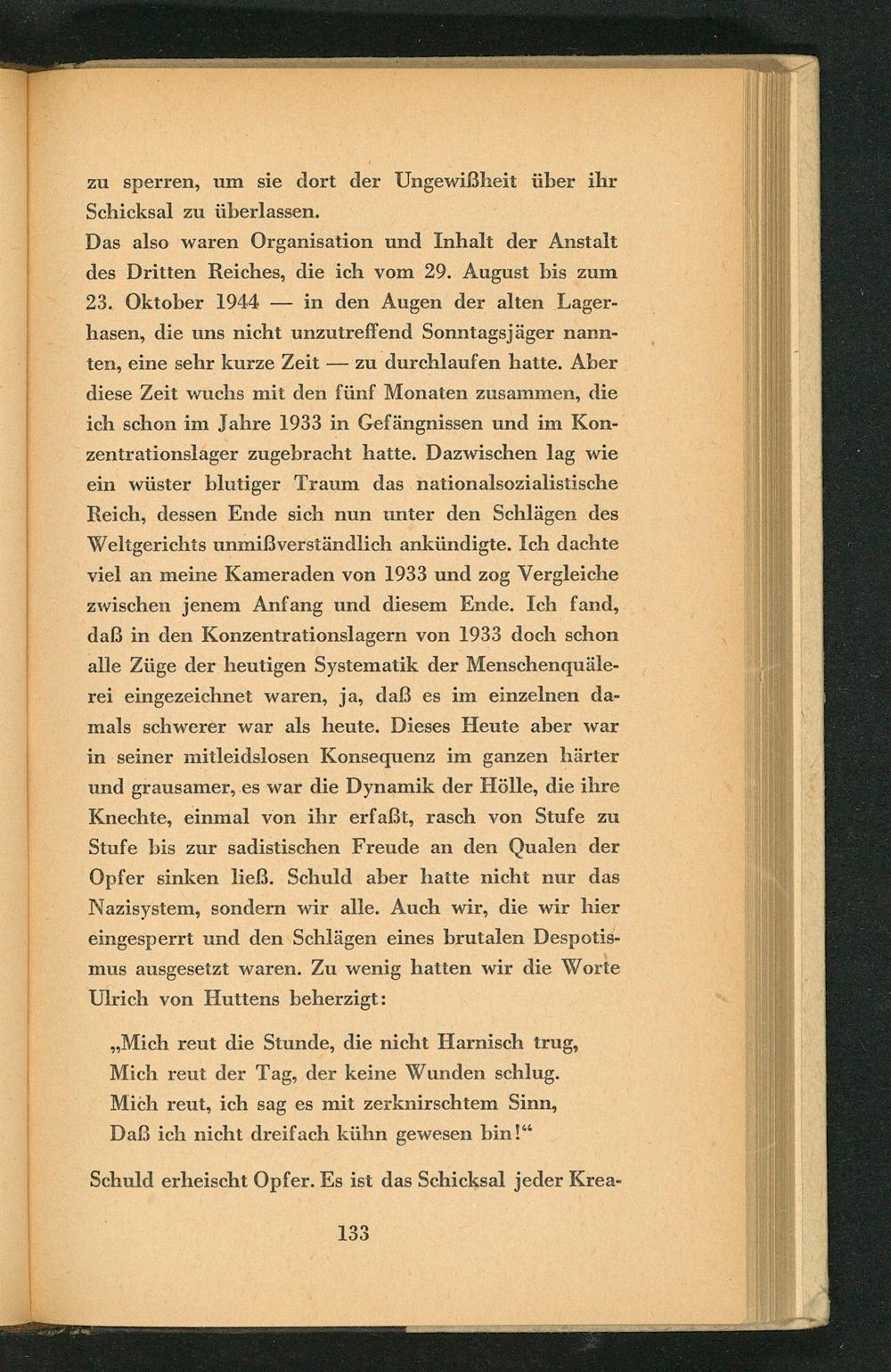 Das also waren Organisation und Inhalt der Anstalt des Dritten Reiches , die ich vom 29. August bis zum 23. Oktober 1944 in den Augen der alten Lagerhasen, die uns nicht unzutreffend Sonntagsjäger nannten, eine sehr kurze Zeit zu durchlaufen hatte. Aber diese Zeit wuchs mit den fünf Monaten zusammen, die ich schon im Jahre 1933 in Gefängnissen und im Konzentrationslager zugebracht hatte. Dazwischen lag wie ein wüster blutiger Traum das nationalsozialistische Reich, dessen Ende sich nun unter den Schlägen des Weltgerichts unmiẞverständlich ankündigte. Ich dachte viel an meine Kameraden von 1933 und zog Vergleiche zwischen jenem Anfang und diesem Ende. Ich fand, daß in den Konzentrationslagern von 1933 doch schon alle Züge der heutigen Systematik der Menschenquälerei eingezeichnet waren, ja, daß es im einzelnen damals schwerer war als heute. Dieses Heute aber war in seiner mitleidslosen Konsequenz im ganzen härter und grausamer, es war die Dynamik der Hölle, die ihre Knechte, einmal von ihr erfaßt, rasch von Stufe zu Stufe bis zur sadistischen Freude an den Qualen der Opfer sinken ließ. Schuld aber hatte nicht nur das Nazisystem, sondern wir alle. Auch wir, die wir hier eingesperrt und den Schlägen eines brutalen Despotismus ausgesetzt waren. Zu wenig hatten wir die Worte Ulrich von Huttens beherzigt: