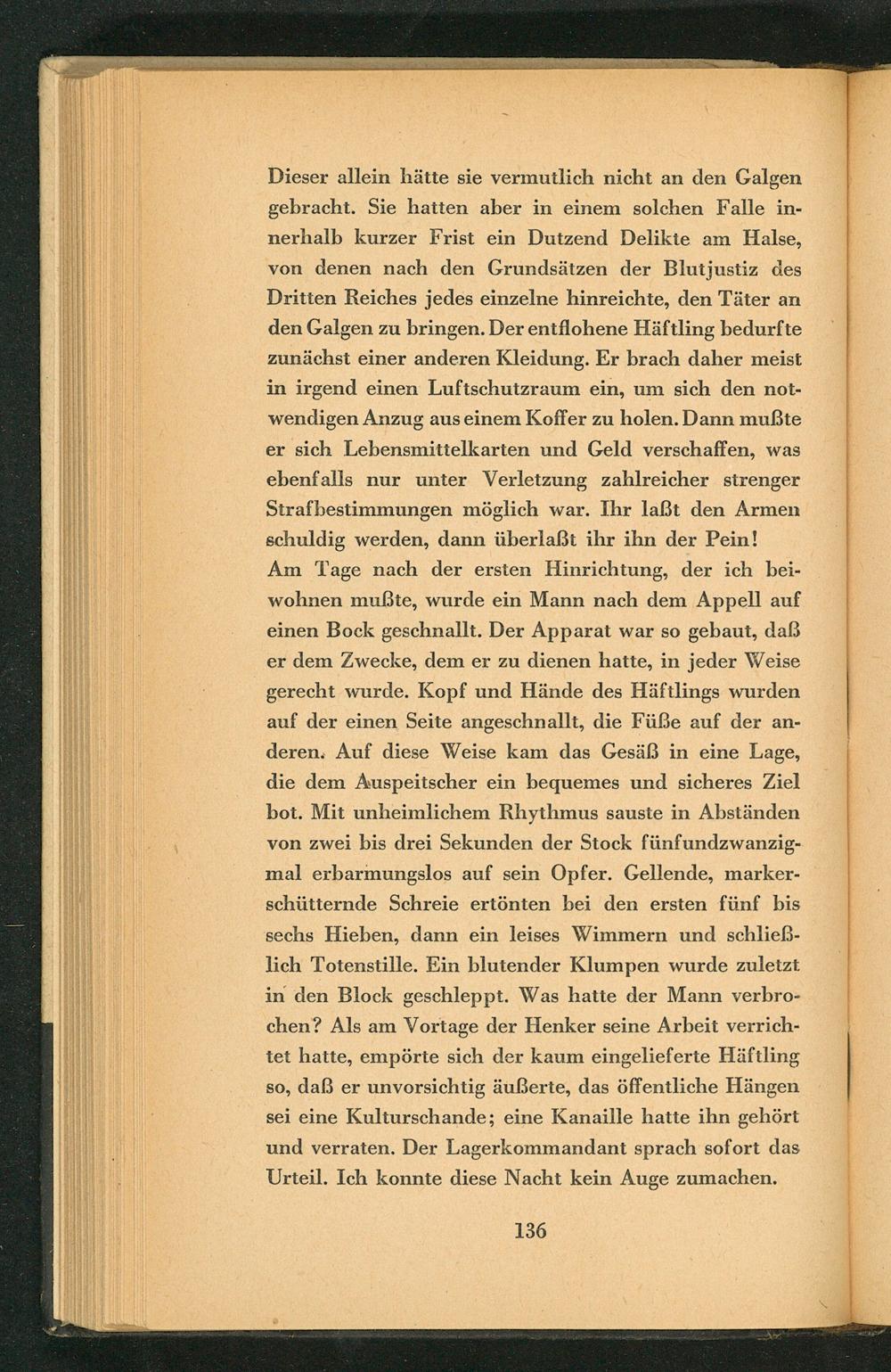 Dieser allein hätte sie vermutlich nicht an den Galgen gebracht. Sie hatten aber in einem solchen Falle innerhalb kurzer Frist ein Dutzend Delikte am Halse, von denen nach den Grundsätzen der Blutjustiz des Dritten Reiches jedes einzelne hinreichte, den Täter an den Galgen zu bringen. Der entflohene Häftling bedurfte zunächst einer anderen Kleidung. Er brach daher meist in irgend einen Luftschutzraum ein, um sich den notwendigen Anzug aus einem Koffer zu holen. Dann mußte er sich Lebensmittelkarten und Geld verschaffen, was ebenfalls nur unter Verletzung zahlreicher strenger Strafbestimmungen möglich war. Ihr laẞt den Armen schuldig werden, dann überlaßt ihr ihn der Pein! Am Tage nach der ersten Hinrichtung, der ich beiwohnen mußte, wurde ein Mann nach dem Appell auf einen Bock geschnallt. Der Apparat war so gebaut, daß er dem Zwecke, dem er zu dienen hatte, in jeder Weise gerecht wurde. Kopf und Hände des Häftlings wurden auf der einen Seite angeschnallt, die Füße auf der anderen. Auf diese Weise kam das Gesäß in eine Lage, die dem Auspeitscher ein bequemes und sicheres Ziel bot. Mit unheimlichem Rhythmus sauste in Abständen von zwei bis drei Sekunden der Stock fünfundzwanzigmal erbarmungslos auf sein Opfer. Gellende, markerschütternde Schreie ertönten bei den ersten fünf bis sechs Hieben, dann ein leises Wimmern und schließlich Totenstille. Ein blutender Klumpen wurde zuletzt in den Block geschleppt. Was hatte der Mann verbrochen? Als am Vortage der Henker seine Arbeit verrichtet hatte, empörte sich der kaum eingelieferte Häftling so, daß er unvorsichtig äußerte, das öffentliche Hängen sei eine Kulturschande; eine Kanaille hatte ihn gehört und verraten. Der Lagerkommandant sprach sofort das Urteil. Ich konnte diese Nacht kein Auge zumachen.