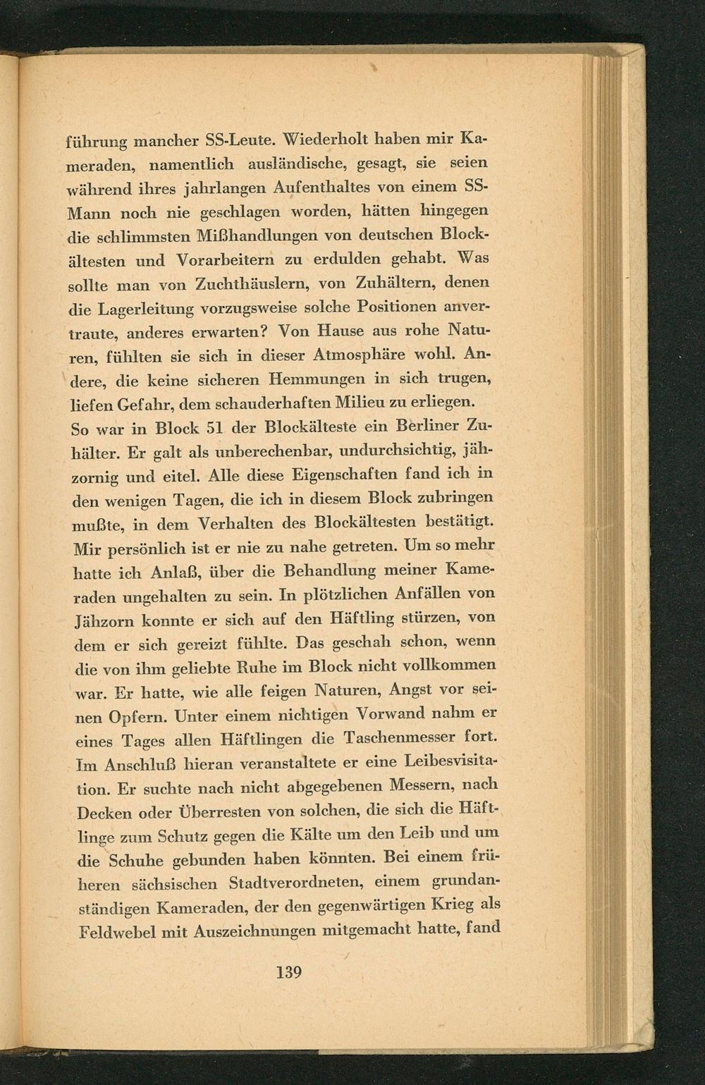 führung mancher SS - Leute. Wiederholt haben mir Kameraden, namentlich ausländische, gesagt, sie seien während ihres jahrlangen Aufenthaltes von einem SSMann noch nie geschlagen worden, hätten hingegen die schlimmsten Mißhandlungen von deutschen Blockältesten und Vorarbeitern zu erdulden gehabt. Was sollte man von Zuchthäuslern, von Zuhältern, denen die Lagerleitung vorzugsweise solche Positionen anvertraute, anderes erwarten? Von Hause aus rohe Naturen, fühlten sie sich in dieser Atmosphäre wohl. Andere, die keine sicheren Hemmungen in sich trugen, liefen Gefahr, dem schauderhaften Milieu zu erliegen. So war in Block 51 der Blockälteste ein Berliner Zuhälter. Er galt als unberechenbar, undurchsichtig, jähzornig und eitel. Alle diese Eigenschaften fand ich in den wenigen Tagen, die ich in diesem Block zubringen mußte, in dem Verhalten des Blockältesten bestätigt. Mir persönlich ist er nie zu nahe getreten. Um so mehr hatte ich Anlaß, über die Behandlung meiner Kameraden ungehalten zu sein. In plötzlichen Anfällen von Jähzorn konnte er sich auf den Häftling stürzen, von dem er sich gereizt fühlte. Das geschah schon, wenn die von ihm geliebte Ruhe im Block nicht vollkommen war. Er hatte, wie alle feigen Naturen, Angst vor seinen Opfern. Unter einem nichtigen Vorwand nahm er eines Tages allen Häftlingen die Taschenmesser fort. Im Anschluß hieran veranstaltete er eine Leibesvisitation. Er suchte nach nicht abgegebenen Messern, nach Decken oder Überresten von solchen, die sich die Häftlinge zum Schutz gegen die Kälte um den Leib und um die Schuhe gebunden haben könnten. Bei einem früheren sächsischen Stadtverordneten, einem grundanständigen Kameraden, der den gegenwärtigen Krieg als Feldwebel mit Auszeichnungen mitgemacht hatte, fand