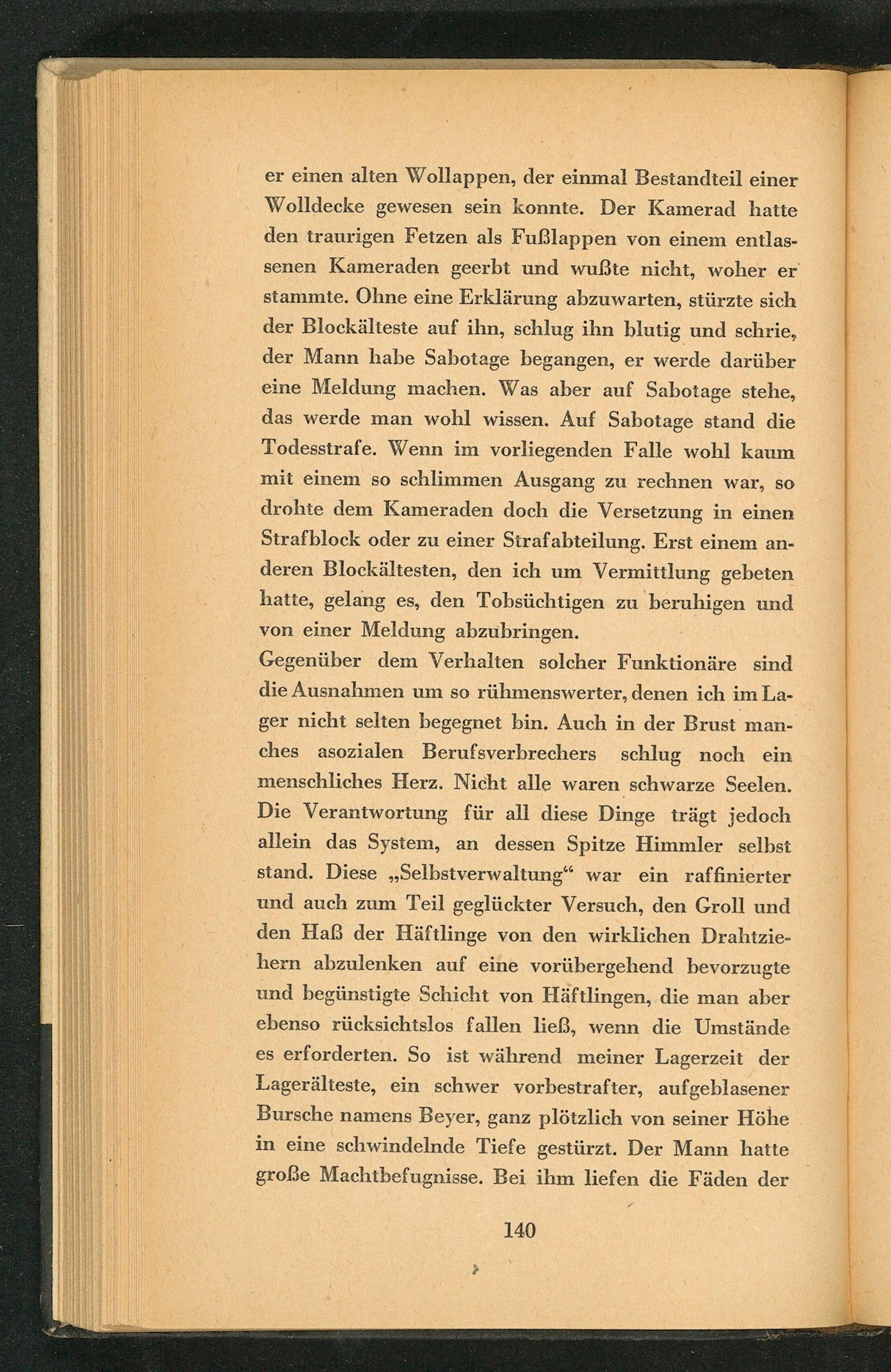 Gegenüber dem Verhalten solcher Funktionäre sind die Ausnahmen um so rühmenswerter, denen ich im Lager nicht selten begegnet bin. Auch in der Brust manches asozialen Berufsverbrechers schlug noch ein menschliches Herz. Nicht alle waren schwarze Seelen. Die Verantwortung für all diese Dinge trägt jedoch allein das System, an dessen Spitze Himmler selbst stand. Diese ,, Selbstverwaltung" war ein raffinierter und auch zum Teil geglückter Versuch, den Groll und den Haß der Häftlinge von den wirklichen Drahtziehern abzulenken auf eine vorübergehend bevorzugte und begünstigte Schicht von Häftlingen, die man aber ebenso rücksichtslos fallen ließ, wenn die Umstände es erforderten. So ist während meiner Lagerzeit der Lagerälteste, ein schwer vorbestrafter, aufgeblasener Bursche namens Beyer, ganz plötzlich von seiner Höhe in eine schwindelnde Tiefe gestürzt. Der Mann hatte große Machtbefugnisse. Bei ihm liefen die Fäden der