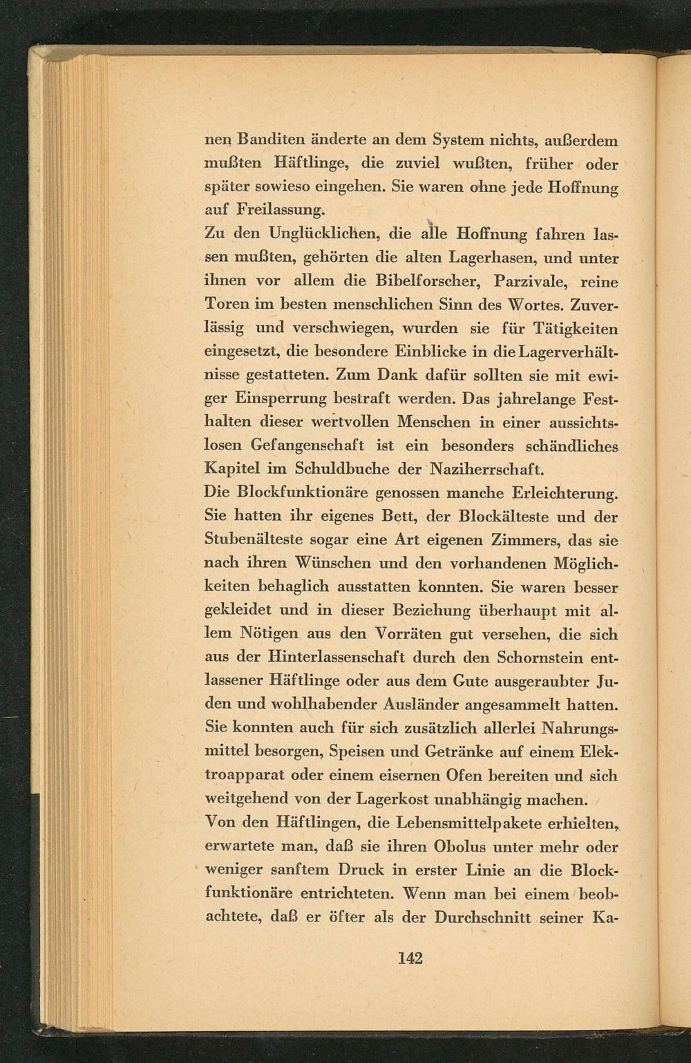 Zu den Unglücklichen, die alle Hoffnung fahren lassen mußten, gehörten die alten Lagerhasen, und unter ihnen vor allem die Bibelforscher, Parzivale, reine Toren im besten menschlichen Sinn des Wortes. Zuverlässig und verschwiegen, wurden sie für Tätigkeiten eingesetzt, die besondere Einblicke in die Lagerverhältnisse gestatteten. Zum Dank dafür sollten sie mit ewiger Einsperrung bestraft werden. Das jahrelange Festhalten dieser wertvollen Menschen in einer aussichtslosen Gefangenschaft ist ein besonders schändliches Kapitel im Schuldbuche der Naziherrschaft. Die Blockfunktionäre genossen manche Erleichterung. Sie hatten ihr eigenes Bett, der Blockälteste und der Stubenälteste sogar eine Art eigenen Zimmers, das sie nach ihren Wünschen und den vorhandenen Möglichkeiten behaglich ausstatten konnten. Sie waren besser gekleidet und in dieser Beziehung überhaupt mit allem Nötigen aus den Vorräten gut versehen, die sich aus der Hinterlassenschaft durch den Schornstein entlassener Häftlinge oder aus dem Gute ausgeraubter Juden und wohlhabender Ausländer angesammelt hatten. Sie konnten auch für sich zusätzlich allerlei Nahrungsmittel besorgen, Speisen und Getränke auf einem Elektroapparat oder einem eisernen Ofen bereiten und sich weitgehend von der Lagerkost unabhängig machen. Von den Häftlingen, die Lebensmittelpakete erhielten, erwartete man, daß sie ihren Obolus unter mehr oder weniger sanftem Druck in erster Linie an die Blockfunktionäre entrichteten. Wenn man bei einem beobachtete, daß er öfter als der Durchschnitt seiner Ka