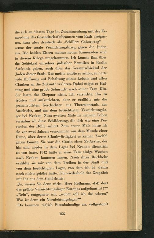 die sich an diesem Tage im Zusammenhang mit der Ermordung des Gesandtschaftsbeamten vom Rath ereigneten, kurz aber drastisch als ,, Schillers Geburtstag" setzte der totale Vernichtungskrieg gegen die Juden ein. Die beiden Eltern meines neuen Kameraden sind in diesem Kriege umgekommen. Ich konnte ihm über das Schicksal einzelner jüdischer Familien in Berlin Auskunft geben, auch über das Gesamtschicksal der Juden dieser Stadt. Das meiste wußte er schon, er hatte jede Hoffnung auf Erhaltung seines Lebens und allen Glauben an die Zukunft verloren. Dabei zeigte er Haltung und eine große Sehnsucht nach seiner Frau. Kinder hatte das Ehepaar nicht. Ich versuchte, ihn zu trösten und aufzurichten, aber er erzählte mir die grauenvollsten Geschichten aus Theresienstadt, aus Auschwitz , und aus dem berüchtigten Vernichtungsla