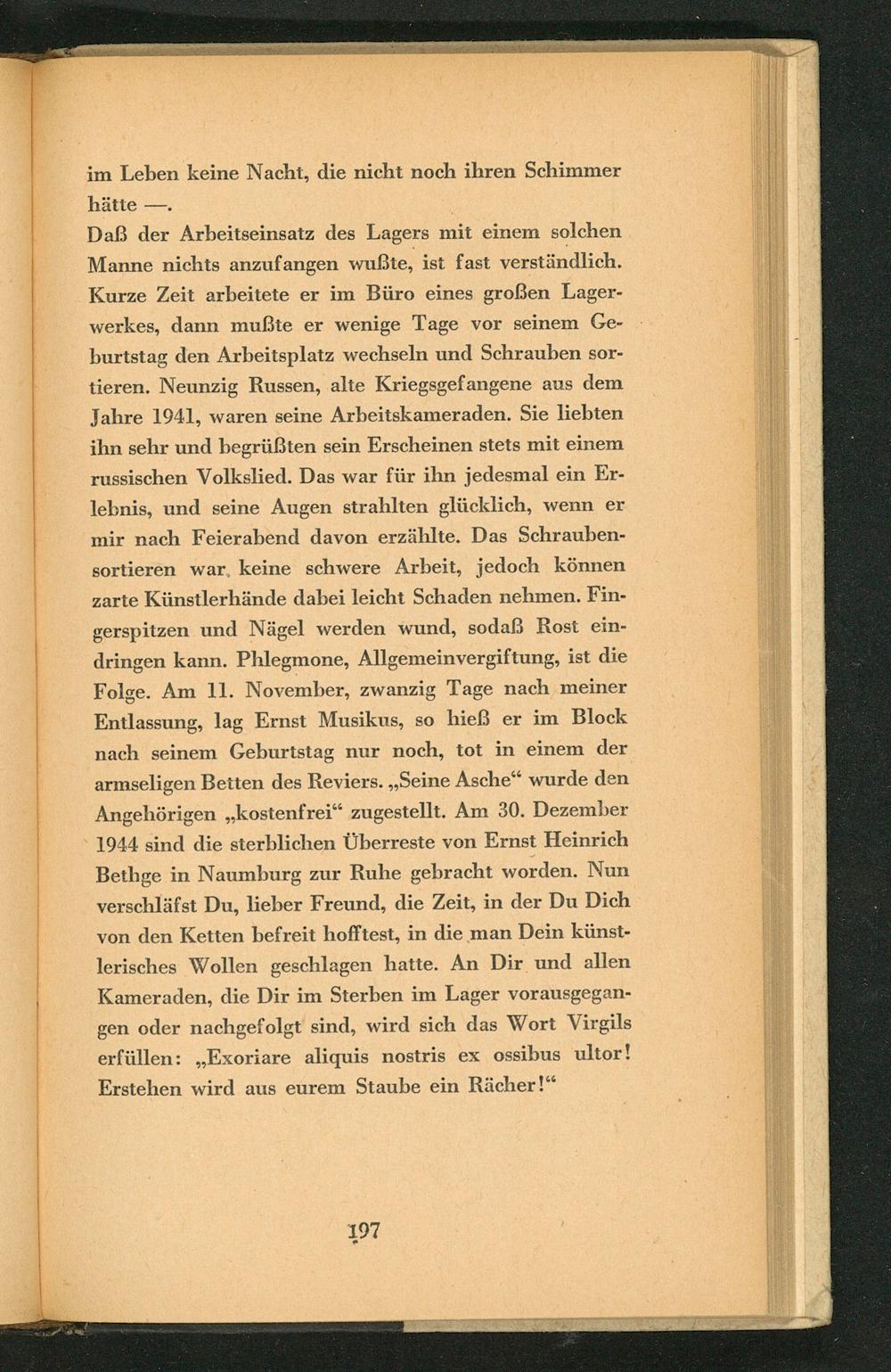 Daß der Arbeitseinsatz des Lagers mit einem solchen Manne nichts anzufangen wußte, ist fast verständlich. Kurze Zeit arbeitete er im Büro eines großen Lagerwerkes, dann mußte er wenige Tage vor seinem Geburtstag den Arbeitsplatz wechseln und Schrauben sortieren. Neunzig Russen, alte Kriegsgefangene aus dem Jahre 1941, waren seine Arbeitskameraden. Sie liebten ihn sehr und begrüßten sein Erscheinen stets mit einem russischen Volkslied. Das war für ihn jedesmal ein Erlebnis, und seine Augen strahlten glücklich, wenn er mir nach Feierabend davon erzählte. Das Schraubensortieren war, keine schwere Arbeit, jedoch können zarte Künstlerhände dabei leicht Schaden nehmen. Fingerspitzen und Nägel werden wund, sodaẞ Rost eindringen kann. Phlegmone, Allgemeinvergiftung, ist die Folge. Am 11. November, zwanzig Tage nach meiner Entlassung, lag Ernst Musikus, so hieß er im Block nach seinem Geburtstag nur noch, tot in einem der armseligen Betten des Reviers. ,, Seine Asche" wurde den Angehörigen„ kostenfrei" zugestellt. Am 30. Dezember 1944 sind die sterblichen Überreste von Ernst Heinrich Bethge in Naumburg zur Ruhe gebracht worden. Nun verschläfst Du, lieber Freund, die Zeit, in der Du Dich von den Ketten befreit hofftest, in die man Dein künstlerisches Wollen geschlagen hatte. An Dir und allen Kameraden, die Dir im Sterben im Lager vorausgegangen oder nachgefolgt sind, wird sich das Wort Virgils erfüllen:„ Exoriare aliquis nostris ex ossibus ultor! Erstehen wird aus eurem Staube ein Rächer!"