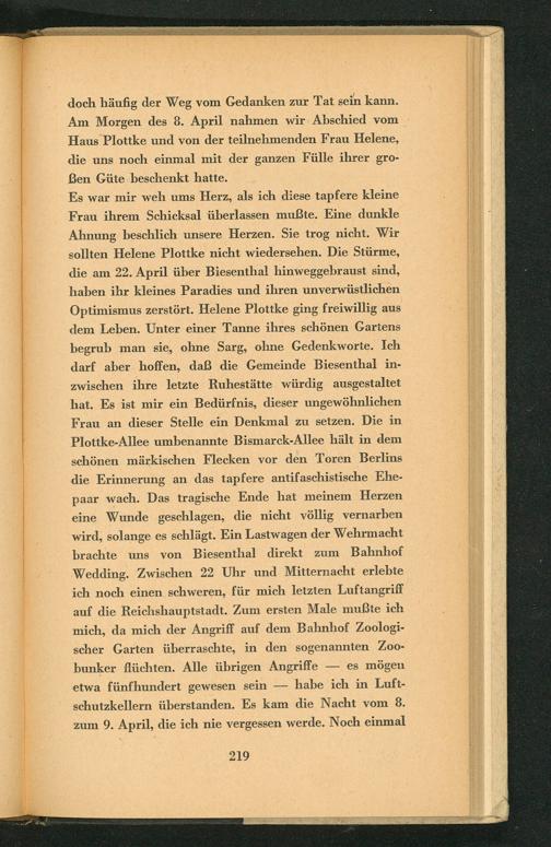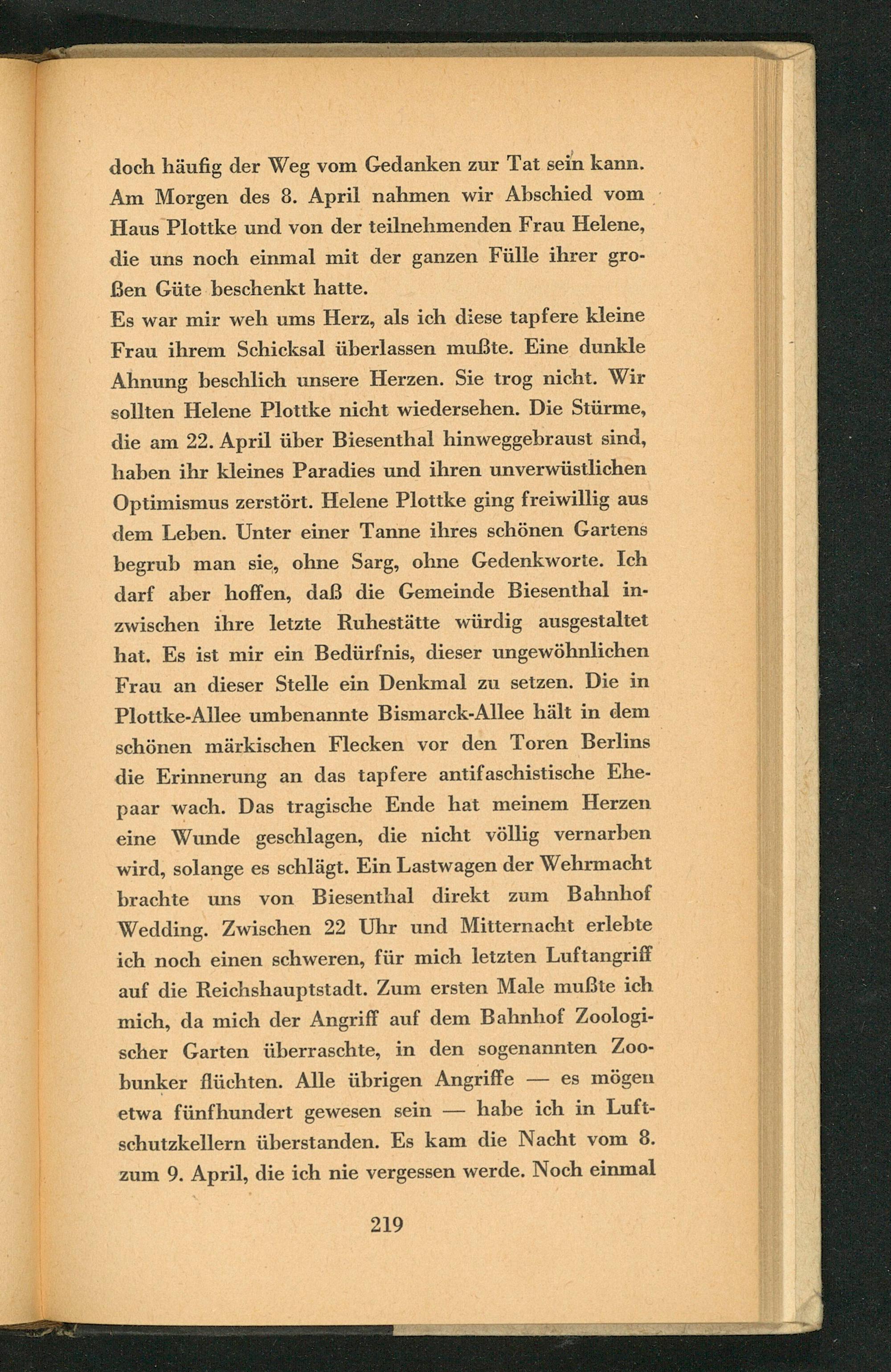 Es war mir weh ums Herz, als ich diese tapfere kleine Frau ihrem Schicksal überlassen mußte. Eine dunkle Ahnung beschlich unsere Herzen. Sie trog nicht. Wir sollten Helene Plottke nicht wiedersehen. Die Stürme, die am 22. April über Biesenthal hinweggebraust sind, haben ihr kleines Paradies und ihren unverwüstlichen Optimismus zerstört. Helene Plottke ging freiwillig aus dem Leben. Unter einer Tanne ihres schönen Gartens begrub man sie, ohne Sarg, ohne Gedenkworte. Ich darf aber hoffen, daß die Gemeinde Biesenthal in- zwischen ihre letzte Ruhestätte würdig ausgestaltet hat. Es ist mir ein Bedürfnis, dieser ungewöhnlichen Frau an dieser Stelle ein Denkmal zu setzen. Die in Plottke-Allee umbenannte Bismarck-Allee hält in dem schönen märkischen Flecken vor den Toren Berlins die Erinnerung an das tapfere antifaschistische Ehe- paar wach. Das tragische Ende hat meinem Herzen eine Wunde geschlagen, die nicht völlig vernarben wird, solange es schlägt. Ein Lastwagen der Wehrmacht brachte uns von Biesenthal direkt zum Bahnhof Wedding . Zwischen 22 Uhr und Mitternacht erlebte ich noch einen schweren, für mich letzten Luftangriff auf die Reichshauptstadt. Zum ersten Male mußte ich mich, da mich der Angriff auf dem Bahnhof Zoologi - scher Garten überraschte, in den sogenannten Zoo- bunker flüchten. Alle übrigen Angriffe— es mögen etwa fünfhundert gewesen sein— habe ich in Luft- schutzkellern überstanden. Es kam die Nacht vom 8. zum 9. April, die ich nie vergessen werde. Noch einmal