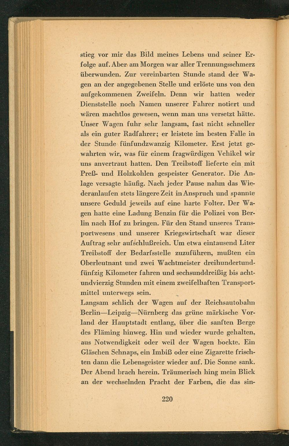 stieg vor mir das Bild meines Lebens und seiner Erfolge auf. Aber am Morgen war aller Trennungsschmerz überwunden. Zur vereinbarten Stunde stand der Wagen an der angegebenen Stelle und erlöste uns von den aufgekommenen Zweifeln. Denn wir hatten weder Dienststelle noch Namen unserer Fahrer notiert und wären machtlos gewesen, wenn man uns versetzt hätte. Unser Wagen fuhr sehr langsam, fast nicht schneller als ein guter Radfahrer; er leistete im besten Falle in der Stunde fünfundzwanzig Kilometer. Erst jetzt gewahrten wir, was für einem fragwürdigen Vehikel wir uns anvertraut hatten. Den Treibstoff lieferte ein mit Preß- und Holzkohlen gespeister Generator. Die Anlage versagte häufig. Nach jeder Pause nahm das Wiederanlaufen stets längere Zeit in Anspruch und spannte unsere Geduld jeweils auf eine harte Folter. Der Wagen hatte eine Ladung Benzin für die Polizei von Berlin nach Hof zu bringen. Für den Stand unseres Transportwesens und unserer Kriegswirtschaft war dieser Auftrag sehr aufschlußreich. Um etwa eintausend Liter Treibstoff der Bedarfsstelle zuzuführen, mußten ein Oberleutnant und zwei Wachtmeister dreihundertundfünfzig Kilometer fahren und sechsunddreißig bis achtundvierzig Stunden mit einem zweifelhaften Transportmittel unterwegs sein.