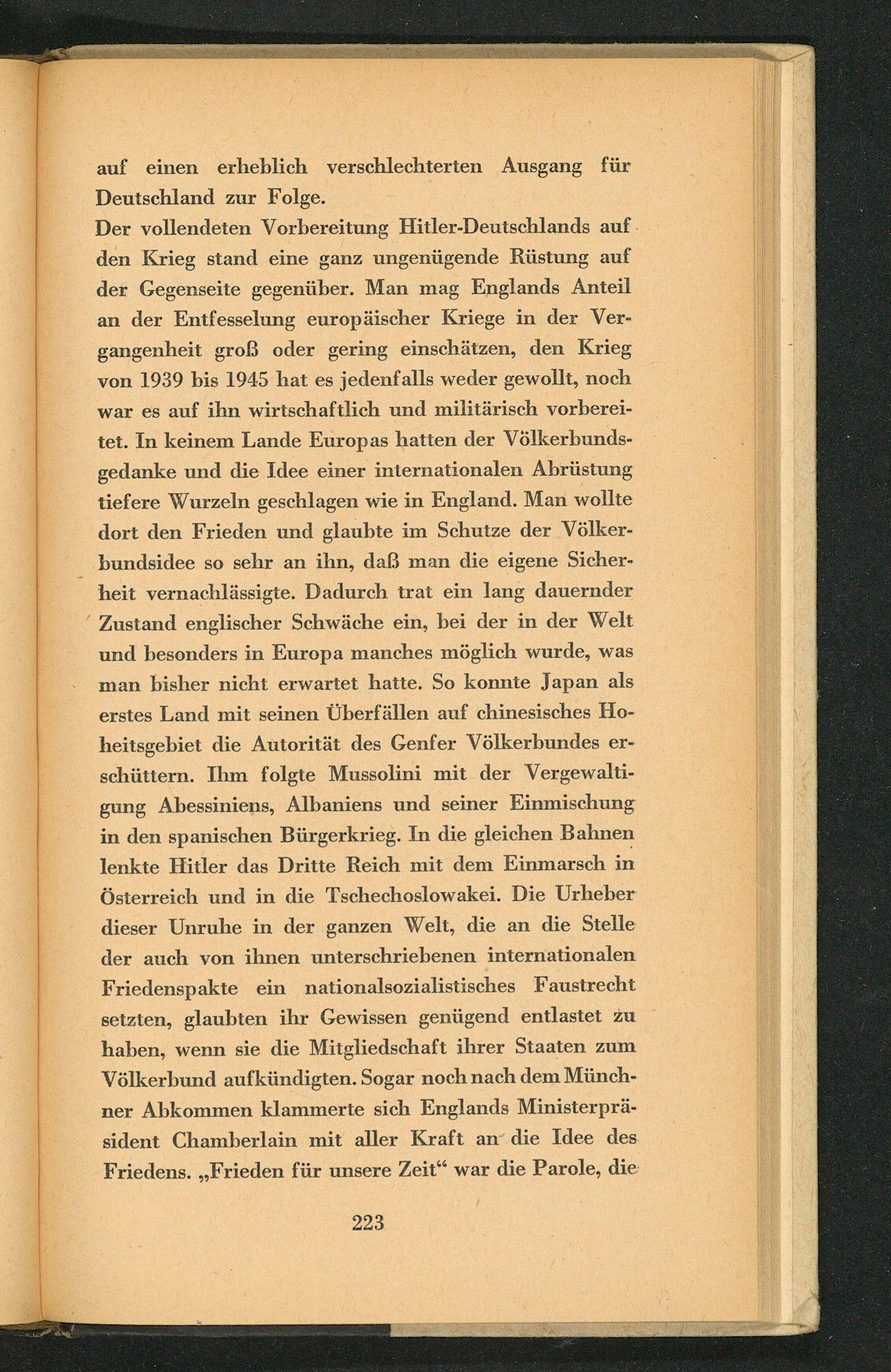 Der vollendeten Vorbereitung Hitler- Deutschlands auf den Krieg stand eine ganz ungenügende Rüstung auf der Gegenseite gegenüber. Man mag Englands Anteil an der Entfesselung europäischer Kriege in der Vergangenheit groß oder gering einschätzen, den Krieg von 1939 bis 1945 hat es jedenfalls weder gewollt, noch war es auf ihn wirtschaftlich und militärisch vorbereitet. In keinem Lande Europas hatten der Völkerbundsgedanke und die Idee einer internationalen Abrüstung tiefere Wurzeln geschlagen wie in England. Man wollte dort den Frieden und glaubte im Schutze der Völkerbundsidee so sehr an ihn, daß man die eigene Sicherheit vernachlässigte. Dadurch trat ein lang dauernder Zustand englischer Schwäche ein, bei der in der Welt und besonders in Europa manches möglich wurde, was man bisher nicht erwartet hatte. So konnte Japan als erstes Land mit seinen Überfällen auf chinesisches Hoheitsgebiet die Autorität des Genfer Völkerbundes erschüttern. Ihm folgte Mussolini mit der Vergewaltigung Abessiniens, Albaniens und seiner Einmischung in den spanischen Bürgerkrieg. In die gleichen Bahnen lenkte Hitler das Dritte Reich mit dem Einmarsch in Österreich und in die Tschechoslowakei . Die Urheber dieser Unruhe in der ganzen Welt, die an die Stelle der auch von ihnen unterschriebenen internationalen Friedenspakte ein nationalsozialistisches Faustrecht setzten, glaubten ihr Gewissen genügend entlastet zu haben, wenn sie die Mitgliedschaft ihrer Staaten zum Völkerbund aufkündigten. Sogar noch nach dem Münchner Abkommen klammerte sich Englands Ministerpräsident Chamberlain mit aller Kraft an die Idee des Friedens. ,, Frieden für unsere Zeit" war die Parole, die