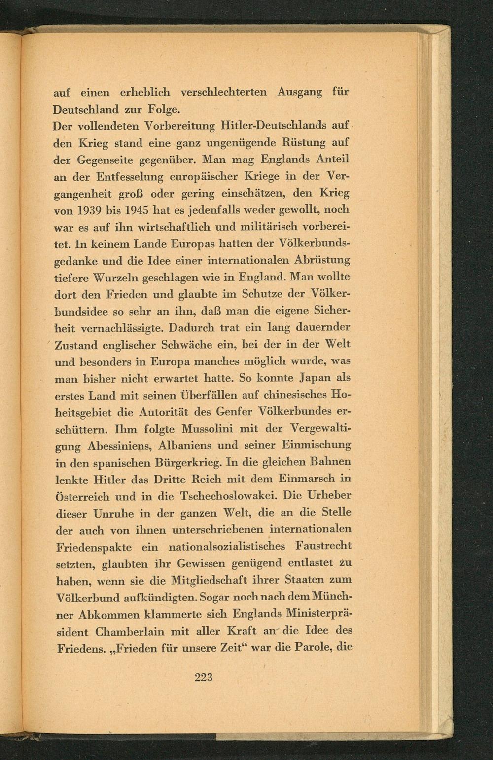 Der vollendeten Vorbereitung Hitler- Deutschlands auf den Krieg stand eine ganz ungenügende Rüstung auf der Gegenseite gegenüber. Man mag Englands Anteil an der Entfesselung europäischer Kriege in der Vergangenheit groß oder gering einschätzen, den Krieg von 1939 bis 1945 hat es jedenfalls weder gewollt, noch war es auf ihn wirtschaftlich und militärisch vorbereitet. In keinem Lande Europas hatten der Völkerbundsgedanke und die Idee einer internationalen Abrüstung tiefere Wurzeln geschlagen wie in England. Man wollte dort den Frieden und glaubte im Schutze der Völkerbundsidee so sehr an ihn, daß man die eigene Sicherheit vernachlässigte. Dadurch trat ein lang dauernder Zustand englischer Schwäche ein, bei der in der Welt und besonders in Europa manches möglich wurde, was man bisher nicht erwartet hatte. So konnte Japan als erstes Land mit seinen Überfällen auf chinesisches Hoheitsgebiet die Autorität des Genfer Völkerbundes erschüttern. Ihm folgte Mussolini mit der Vergewaltigung Abessiniens, Albaniens und seiner Einmischung in den spanischen Bürgerkrieg. In die gleichen Bahnen lenkte Hitler das Dritte Reich mit dem Einmarsch in Österreich und in die Tschechoslowakei . Die Urheber dieser Unruhe in der ganzen Welt, die an die Stelle der auch von ihnen unterschriebenen internationalen Friedenspakte ein nationalsozialistisches Faustrecht setzten, glaubten ihr Gewissen genügend entlastet zu haben, wenn sie die Mitgliedschaft ihrer Staaten zum Völkerbund aufkündigten. Sogar noch nach dem Münchner Abkommen klammerte sich Englands Ministerpräsident Chamberlain mit aller Kraft an die Idee des Friedens. ,, Frieden für unsere Zeit" war die Parole, die