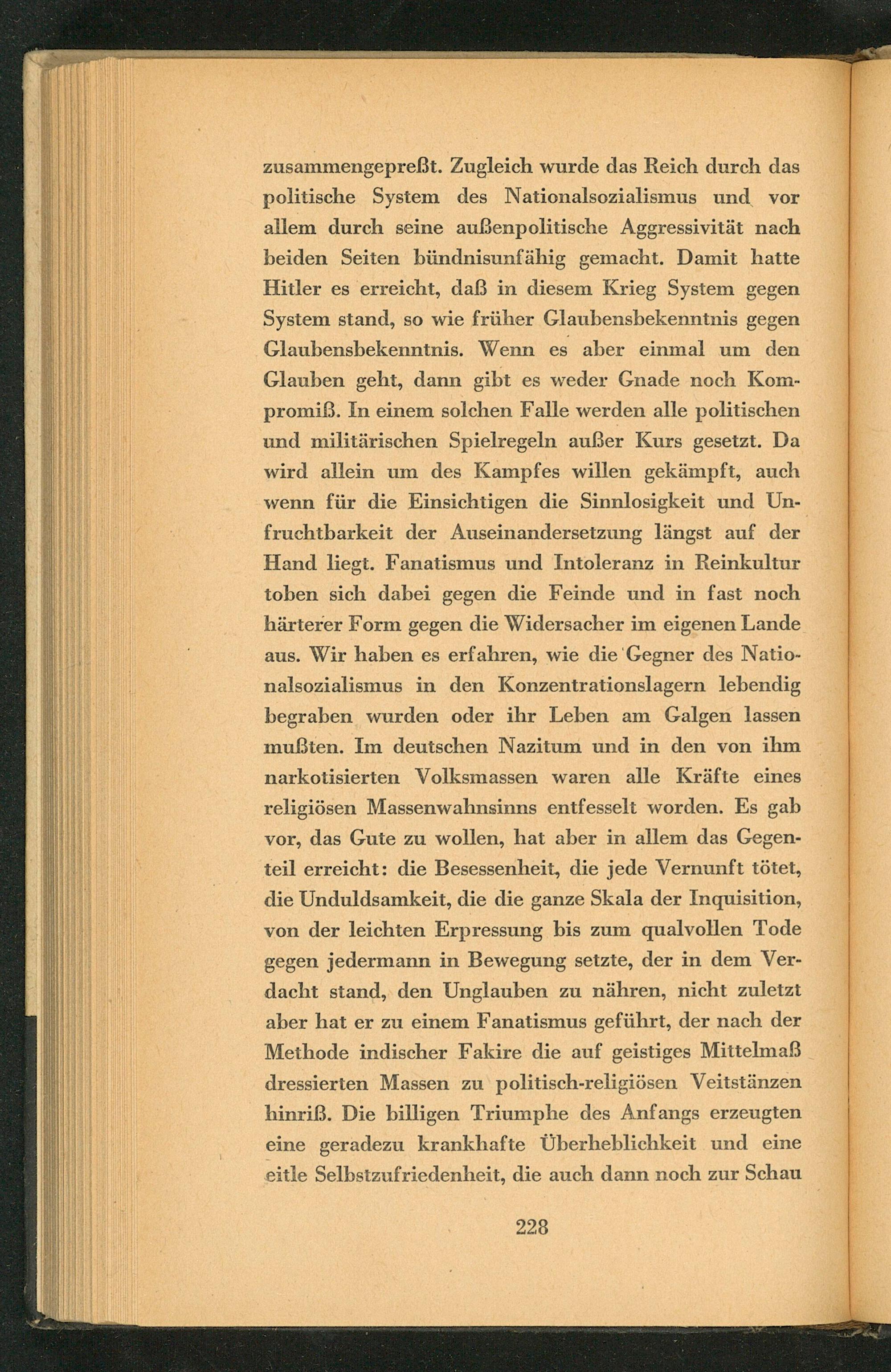zusammengepreßt. Zugleich wurde das Reich durch das politische System des Nationalsozialismus und vor allem durch seine außenpolitische Aggressivität nach beiden Seiten bündnisunfähig gemacht. Damit hatte Hitler es erreicht, daß in diesem Krieg System gegen System stand, so wie früher Glaubensbekenntnis gegen Glaubensbekenntnis. Wenn es aber einmal um den Glauben geht, dann gibt es weder Gnade noch Kompromiß. In einem solchen Falle werden alle politischen und militärischen Spielregeln außer Kurs gesetzt. Da wird allein um des Kampfes willen gekämpft, auch wenn für die Einsichtigen die Sinnlosigkeit und Unfruchtbarkeit der Auseinandersetzung längst auf der Hand liegt. Fanatismus und Intoleranz in Reinkultur toben sich dabei gegen die Feinde und in fast noch härterer Form gegen die Widersacher im eigenen Lande aus. Wir haben es erfahren, wie die Gegner des Nationalsozialismus in den Konzentrationslagern lebendig begraben wurden oder ihr Leben am Galgen lassen mußten. Im deutschen Nazitum und in den von ihm narkotisierten Volksmassen waren alle Kräfte eines religiösen Massenwahnsinns entfesselt worden. Es gab vor, das Gute zu wollen, hat aber in allem das Gegenteil erreicht: die Besessenheit, die jede Vernunft tötet, die Unduldsamkeit, die die ganze Skala der Inquisition , von der leichten Erpressung bis zum qualvollen Tode gegen jedermann in Bewegung setzte, der in dem Verdacht stand, den Unglauben zu nähren, nicht zuletzt aber hat er zu einem Fanatismus geführt, der nach der Methode indischer Fakire die auf geistiges Mittelmaẞ dressierten Massen zu politisch- religiösen Veitstänzen hinriẞ. Die billigen Triumphe des Anfangs erzeugten eine geradezu krankhafte Überheblichkeit und eine eitle Selbstzufriedenheit, die auch dann noch zur Schau