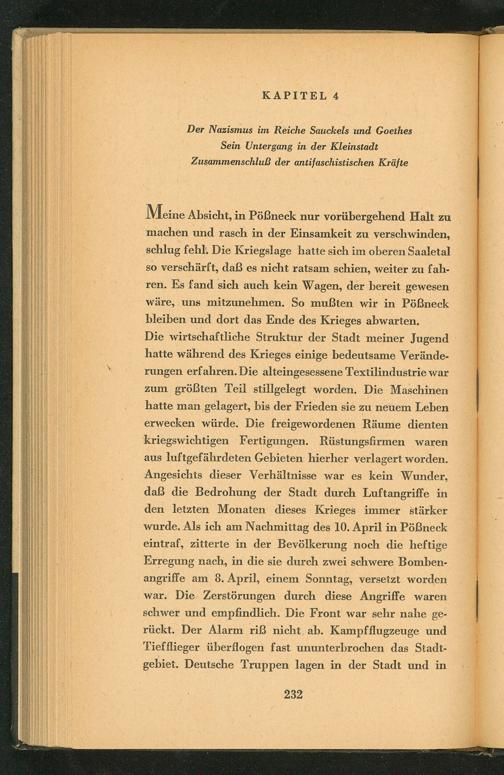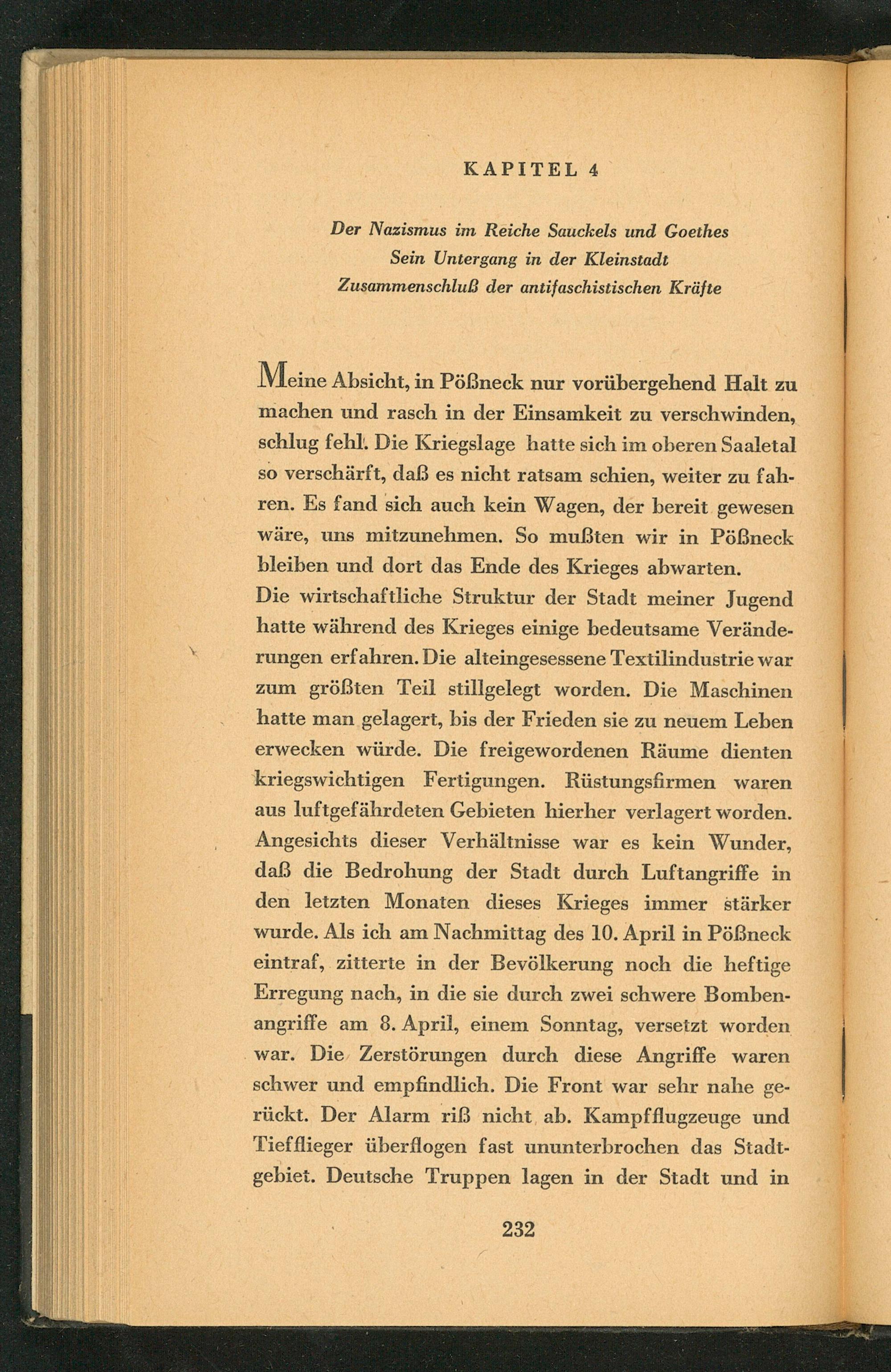 Meine Absicht, in Pößneck nur vorübergehend Halt zu machen und rasch in der Einsamkeit zu verschwinden, schlug fehl. Die Kriegslage hatte sich im oberen Saaletal so verschärft, daß es nicht ratsam schien, weiter zu fahren. Es fand sich auch kein Wagen, der bereit gewesen wäre, uns mitzunehmen. So mußten wir in Pößneck bleiben und dort das Ende des Krieges abwarten. Die wirtschaftliche Struktur der Stadt meiner Jugend hatte während des Krieges einige bedeutsame Veränderungen erfahren. Die alteingesessene Textilindustrie war zum größten Teil stillgelegt worden. Die Maschinen hatte man gelagert, bis der Frieden sie zu neuem Leben erwecken würde. Die freigewordenen Räume dienten kriegswichtigen Fertigungen. Rüstungsfirmen waren aus luftgefährdeten Gebieten hierher verlagert worden. Angesichts dieser Verhältnisse war es kein Wunder, daß die Bedrohung der Stadt durch Luftangriffe in den letzten Monaten dieses Krieges immer stärker wurde. Als ich am Nachmittag des 10. April in Pößneck eintraf, zitterte in der Bevölkerung noch die heftige Erregung nach, in die sie durch zwei schwere Bombenangriffe am 8. April, einem Sonntag, versetzt worden war. Die Zerstörungen durch diese Angriffe waren schwer und empfindlich. Die Front war sehr nahe gerückt. Der Alarm riß nicht ab. Kampfflugzeuge und Tiefflieger überflogen fast ununterbrochen das Stadtgebiet. Deutsche Truppen lagen in der Stadt und in
