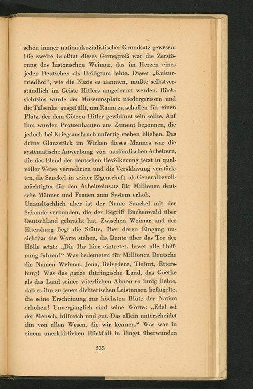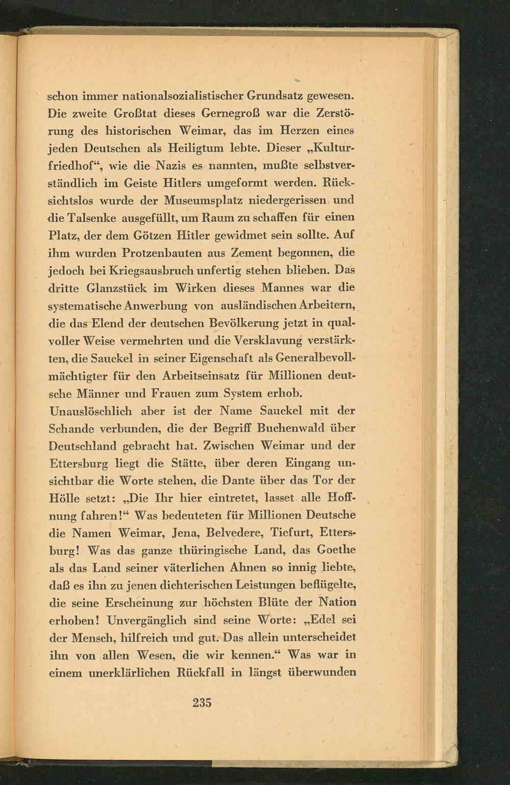 Unauslöschlich aber ist der Name Sauckel mit der Schande verbunden, die der Begriff Buchenwald über Deutschland gebracht hat. Zwischen Weimar und der Eitersburg liegt die Stätte, über deren Eingang un- sichtbar die Worte stehen, die Dante über das Tor der Hölle setzt:„Die Ihr hier eintretet, lasset. alle Hoff- nung fahren!“ Was bedeuteten für Millionen Deutsche die Namen Weimar, Jena, Belvedere, Tiefurt , Etiers- burg! Was das ganze thüringische Land, das Goethe als das Land seiner väterlichen Ahnen so innig liebte, daß es ihn zu jenen dichterischen Leistungen beflügelte, die seine Erscheinung zur höchsten Blüte der Nation erhoben! Unvergänglich sind seine Worte:„Edel sei der Mensch, hilfreich und gut. Das allein unterscheidet ihn von allen Wesen, die wir kennen.“ Was war in