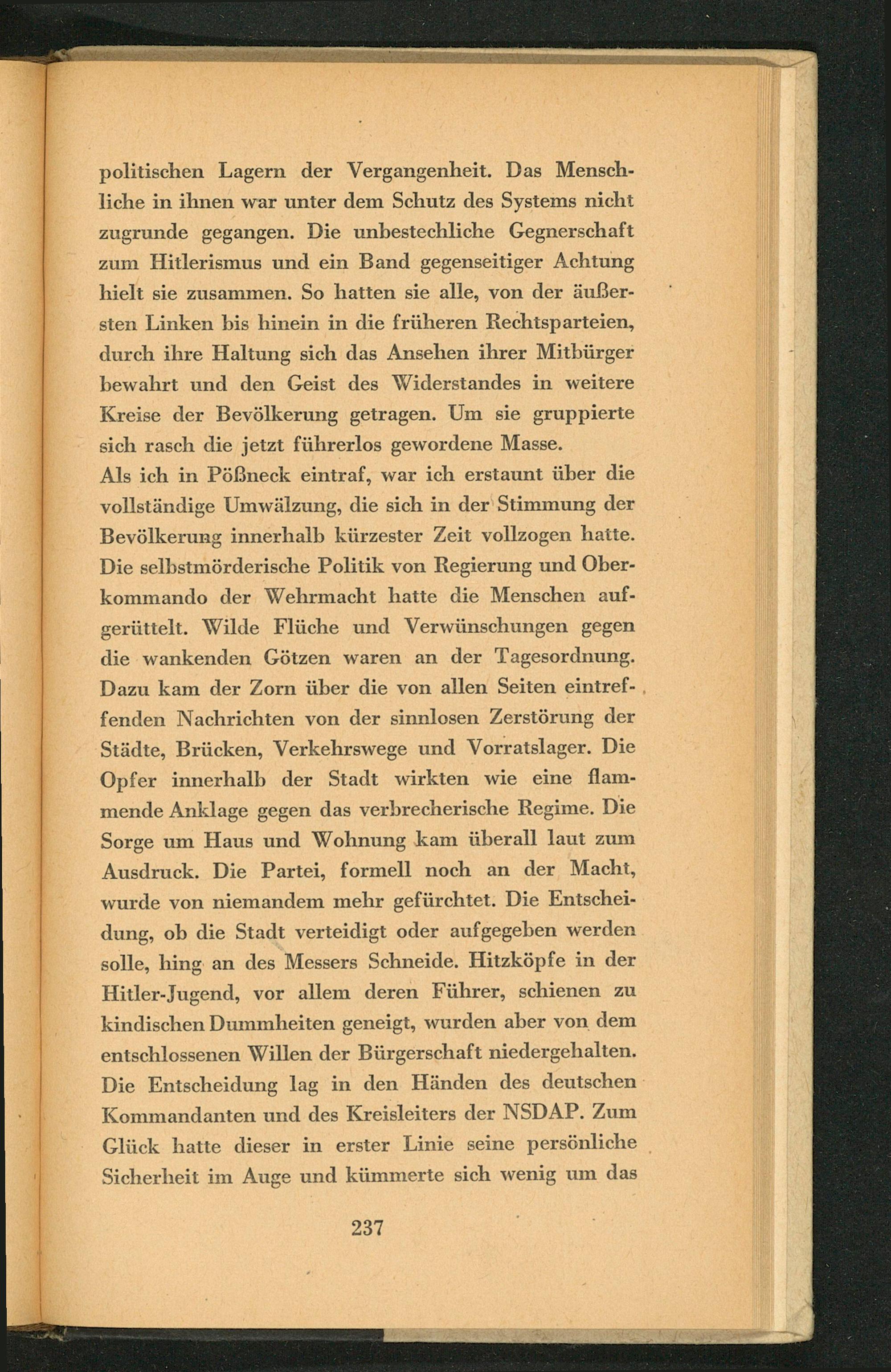 politischen Lagern der Vergangenheit. Das Menschliche in ihnen war unter dem Schutz des Systems nicht zugrunde gegangen. Die unbestechliche Gegnerschaft zum Hitlerismus und ein Band gegenseitiger Achtung hielt sie zusammen. So hatten sie alle, von der äußersten Linken bis hinein in die früheren Rechtsparteien, durch ihre Haltung sich das Ansehen ihrer Mitbürger bewahrt und den Geist des Widerstandes in weitere Kreise der Bevölkerung getragen. Um sie gruppierte sich rasch die jetzt führerlos gewordene Masse. Als ich in Pößneck eintraf, war ich erstaunt über die vollständige Umwälzung, die sich in der Stimmung der Bevölkerung innerhalb kürzester Zeit vollzogen hatte. Die selbstmörderische Politik von Regierung und Oberkommando der Wehrmacht hatte die Menschen aufgerüttelt. Wilde Flüche und Verwünschungen gegen die wankenden Götzen waren an der Tagesordnung. Dazu kam der Zorn über die von allen Seiten eintref-, fenden Nachrichten von der sinnlosen Zerstörung der Städte, Brücken, Verkehrswege und Vorratslager. Die Opfer innerhalb der Stadt wirkten wie eine flammende Anklage gegen das verbrecherische Regime. Die Sorge um Haus und Wohnung kam überall laut zum Ausdruck. Die Partei, formell noch an der Macht, wurde von niemandem mehr gefürchtet. Die Entscheidung, ob die Stadt verteidigt oder aufgegeben werden solle, hing an des Messers Schneide. Hitzköpfe in der Hitler- Jugend , vor allem deren Führer, schienen zu kindischen Dummheiten geneigt, wurden aber von dem entschlossenen Willen der Bürgerschaft niedergehalten. Die Entscheidung lag in den Händen des deutschen Kommandanten und des Kreisleiters der NSDAP . Zum Glück hatte dieser in erster Linie seine persönliche Sicherheit im Auge und kümmerte sich wenig um das