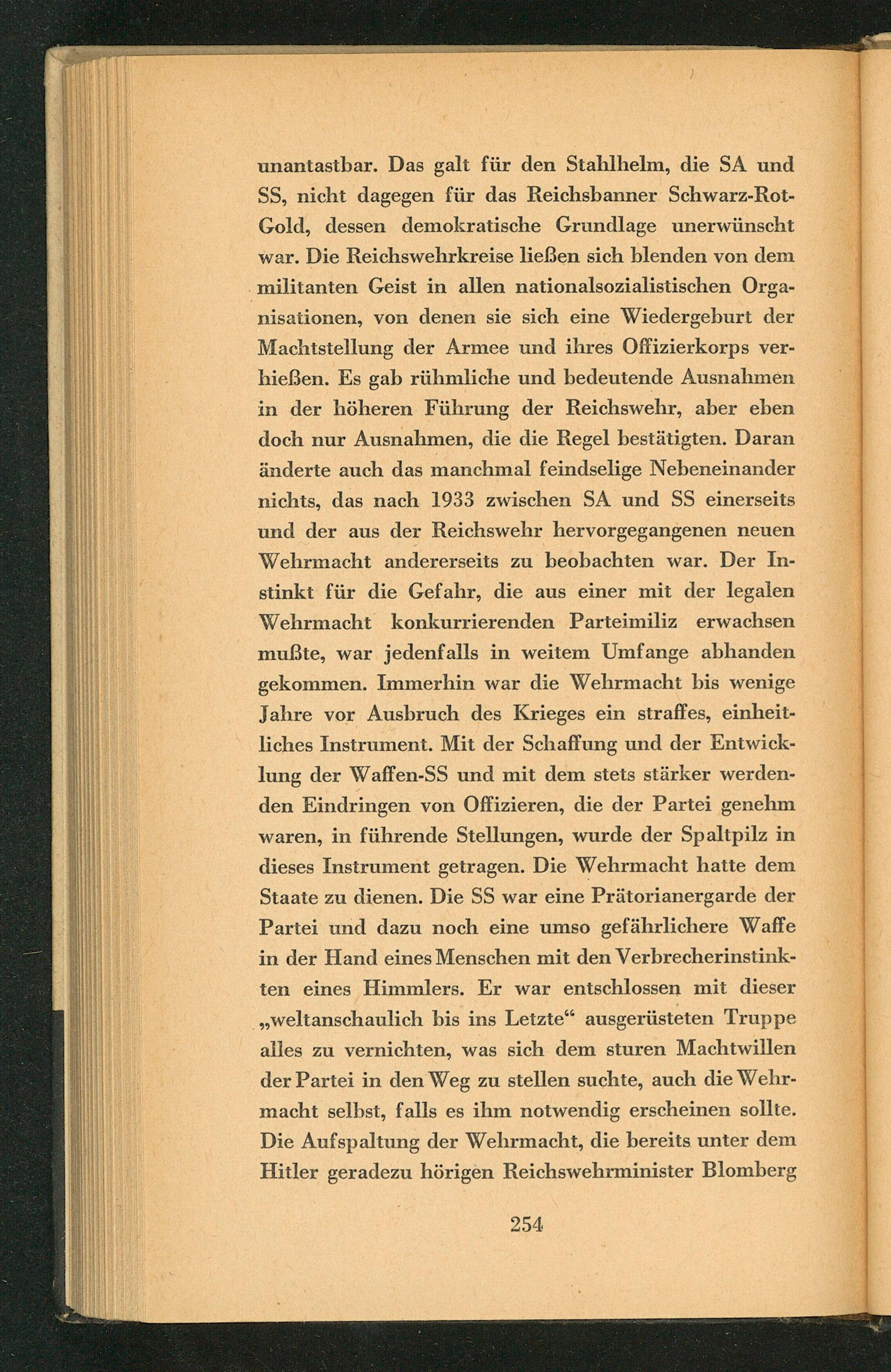unantastbar. Das galt für den Stahlhelm, die SA und SS, nicht dagegen für das Reichsbanner Schwarz- RotGold, dessen demokratische Grundlage unerwünscht war. Die Reichswehrkreise ließen sich blenden von dem militanten Geist in allen nationalsozialistischen Organisationen, von denen sie sich eine Wiedergeburt der Machtstellung der Armee und ihres Offizierkorps verhießen. Es gab rühmliche und bedeutende Ausnahmen in der höheren Führung der Reichswehr , aber eben doch nur Ausnahmen, die die Regel bestätigten. Daran änderte auch das manchmal feindselige Nebeneinander nichts, das nach 1933 zwischen SA und SS einerseits und der aus der Reichswehr hervorgegangenen neuen Wehrmacht andererseits zu beobachten war. Der Instinkt für die Gefahr, die aus einer mit der legalen Wehrmacht konkurrierenden Parteimiliz erwachsen mußte, war jedenfalls in weitem Umfange abhanden gekommen. Immerhin war die Wehrmacht bis wenige Jahre vor Ausbruch des Krieges ein straffes, einheitliches Instrument. Mit der Schaffung und der Entwicklung der Waffen- SS und mit dem stets stärker werdenden Eindringen von Offizieren, die der Partei genehm waren, in führende Stellungen, wurde der Spaltpilz in dieses Instrument getragen. Die Wehrmacht hatte dem Staate zu dienen. Die SS war eine Prätorianergarde der Partei und dazu noch eine umso gefährlichere Waffe in der Hand eines Menschen mit den Verbrecherinstinkten eines Himmlers. Er war entschlossen mit dieser ,, weltanschaulich bis ins Letzte" ausgerüsteten Truppe alles zu vernichten, was sich dem sturen Machtwillen der Partei in den Weg zu stellen suchte, auch die Wehrmacht selbst, falls es ihm notwendig erscheinen sollte. Die Aufspaltung der Wehrmacht , die bereits unter dem Hitler geradezu hörigen Reichswehrminister Blomberg