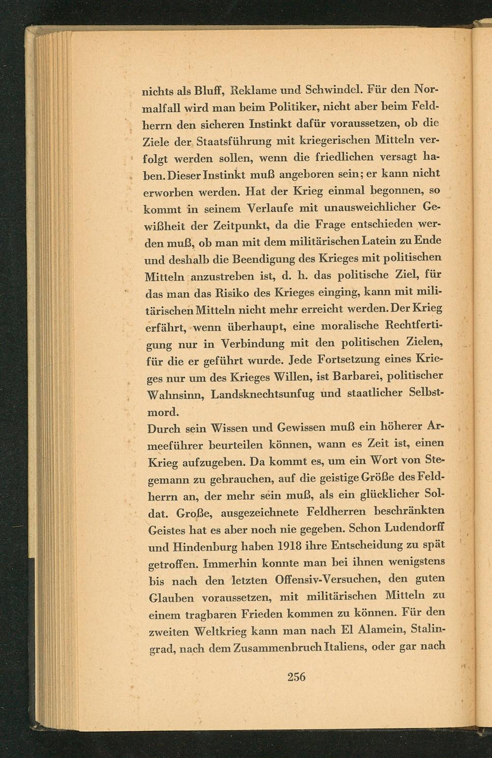 nichts als Bluff, Reklame und Schwindel. Für den Normalfall wird man beim Politiker, nicht aber beim Feldherrn den sicheren Instinkt dafür voraussetzen, ob die Ziele der Staatsführung mit kriegerischen Mitteln verfolgt werden sollen, wenn die friedlichen versagt haben. Dieser Instinkt muß angeboren sein; er kann nicht erworben werden. Hat der Krieg einmal begonnen, so kommt in seinem Verlaufe mit unausweichlicher Gewißheit der Zeitpunkt, da die Frage entschieden werden muß, ob man mit dem militärischen Latein zu Ende und deshalb die Beendigung des Krieges mit politischen Mitteln anzustreben ist, d. h. das politische Ziel, für das man das Risiko des Krieges einging, kann mit militärischen Mitteln nicht mehr erreicht werden. Der Krieg erfährt, wenn überhaupt, eine moralische Rechtfertigung nur in Verbindung mit den politischen Zielen, für die er geführt wurde. Jede Fortsetzung eines Krieges nur um des Krieges Willen, ist Barbarei, politischer Wahnsinn, Landsknechtsunfug und staatlicher Selbstmord.
