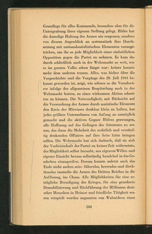 Grundlage für alles Kommende, besonders aber für die Untergrabung ihrer eigenen Stellung gelegt. Hitler hat die damalige Haltung der Armee nie vergessen, sondern von diesem Augenblick an systematisch ihre Durchsetzung mit nationalsozialistischen Elementen vorangetrieben, um ihr so jede Möglichkeit einer einheitlichen Opposition gegen die Partei zu nehmen. Es kam dadurch schließlich auch in der Wehrmacht so weit, wie es im ganzen Volke schon längst war: keiner konnte mehr dem anderen trauen. Alles, was bisher über die Vorgeschichte und die Vorgänge des 20. Juli 1944 bekannt geworden ist, zeigt, wie schwer es die Verschwörer infolge der allgemeinen Bespitzelung auch in der Wehrmacht hatten, zu einer wirksamen Aktion schreiten zu können. Die Notwendigkeit, mit Rücksicht auf die Verseuchung der Armee durch nazistische Elemente den Kreis der Mitwisser denkbar klein zu halten, hat jedes größere Unternehmen von Anfang an unmöglich gemacht und die aktiven Gegner Hitlers gezwungen, alle Hoffnung auf das Gelingen des Attentates zu setzen, das dann die Mehrheit der rechtlich und vernünftig denkenden Offiziere auf ihre Seite hätte bringen sollen. Die Wehrmacht hat sich dadurch, daß sie sich der Vorherrschaft der Partei zu keiner Zeit widersetzte, der Möglichkeit selbst beraubt, aus eigenem Willen und eigener Einsicht heraus selbständig handelnd in das Geschehen einzugreifen. Darum konnte zuletzt auch das Ende nicht anders sein: führerlos, herrenlos und direktionslos taumelte die Armee des Dritten Reiches in die Auflösung, ins Chaos. Alle Möglichkeiten für eine erträgliche Beendigung des Krieges, für eine geordnete Demobilisierung und Rückführung der Millionen deutscher Menschen in Heimat und friedliche Tätigkeit waren verspielt worden zugunsten von Wahnideen einer