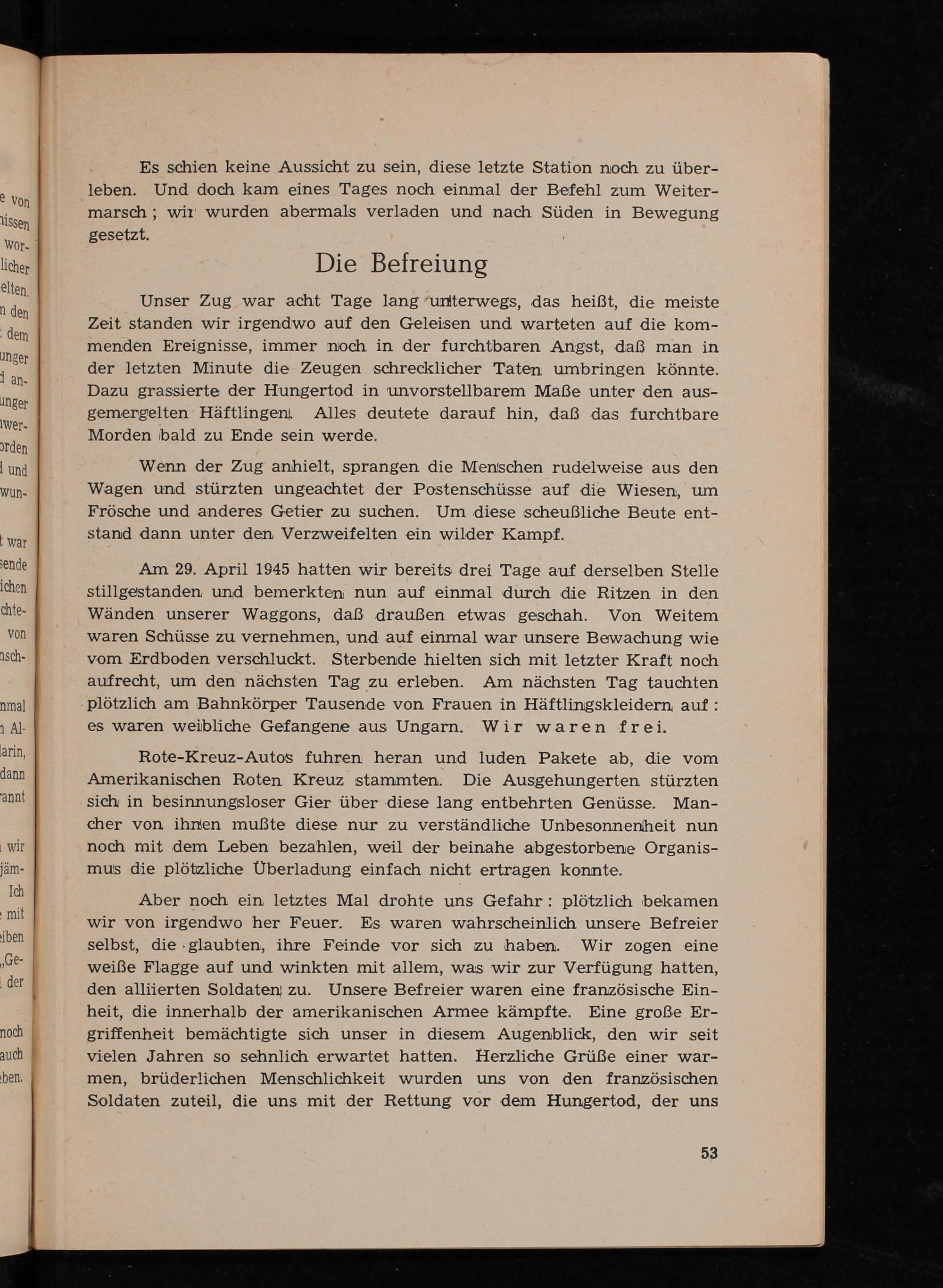 Am 29. April 1945 hatten wir bereits drei Tage auf derselben Stelle stillgestanden und bemerkten nun auf einmal durch die Ritzen in den Wänden unserer Waggons, daß draußen etwas geschah. Von Weitem waren Schüsse zu vernehmen, und auf einmal war unsere Bewachung wie vom Erdboden verschluckt. Sterbende hielten sich mit letzter Kraft noch aufrecht, um den nächsten Tag zu erleben. Am nächsten Tag tauchten plötzlich am Bahnkörper Tausende von Frauen in Häftlingskleidern; auf: es waren weibliche Gefangene aus Ungarn . Wir waren frei.
