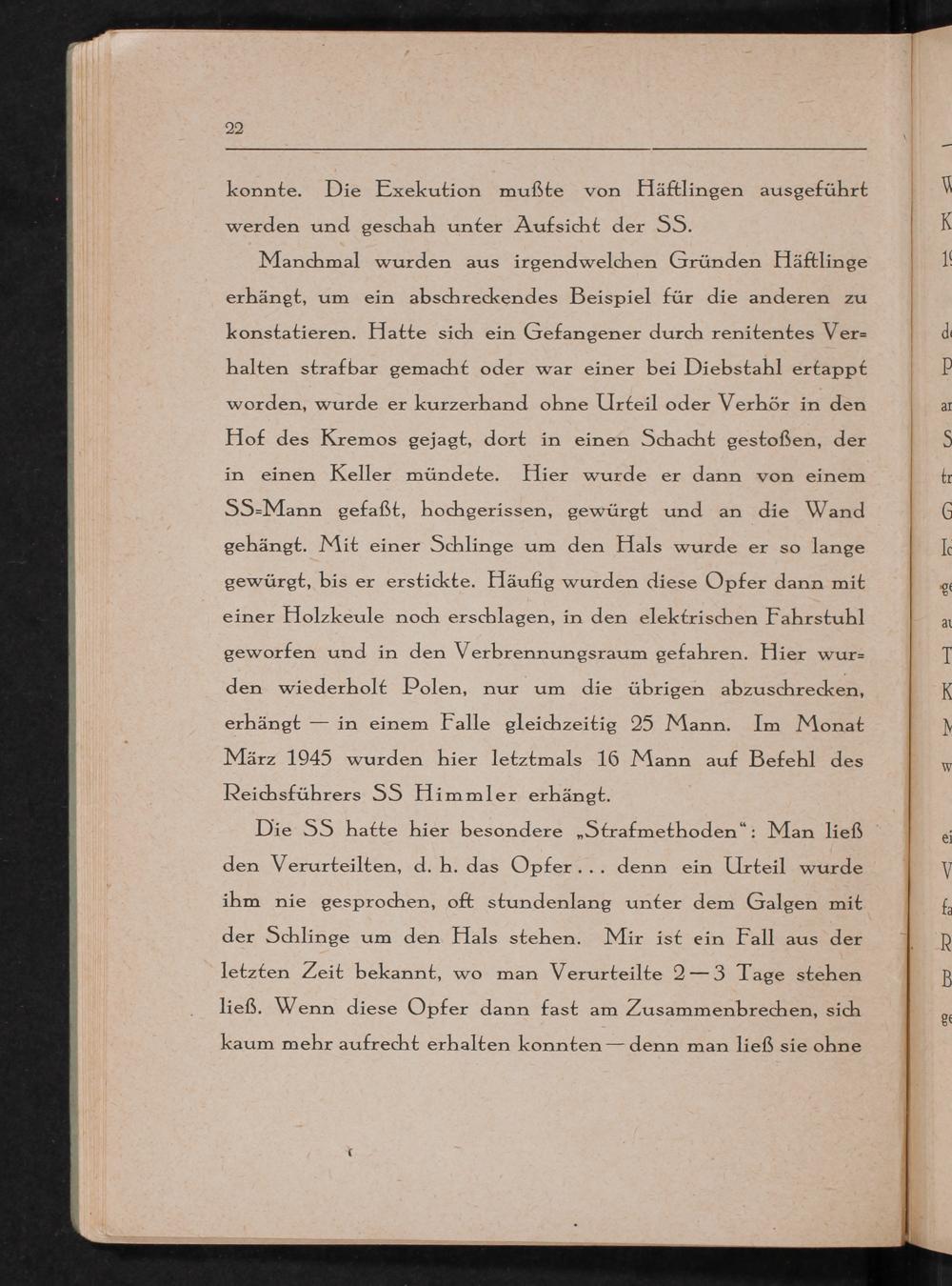 Die SS hatte hier besondere„Strafmethoden“: Man ließ den Verurteilten, d.h. das Opfer... denn ein Urteil wurde ihm nie gesprochen, oft stundenlang unter dem Galgen mit der Schlinge um den Hals stehen. Mir ist ein Fall aus der letzten Zeit bekannt, wo man Verurteilte 2—3 Tage stehen ließ. Wenn diese Opfer dann fast am Zusammenbrechen, sich