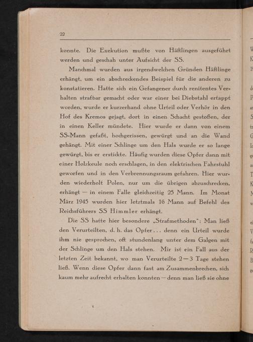 Manchmal wurden aus irgendwelchen Gründen Häftlinge erhängt, um ein abschreckendes Beispiel für die anderen zu konstatieren. Hatte sich ein Gefangener durch renitentes Ver- halten strafbar gemacht oder war einer bei Diebstahl ertappt worden, wurde er kurzerhand ohne Urteil oder Verhör in den Hof des Kremos gejagt, dort in einen Schacht gestoßen, der in einen Keller mündete. Hier wurde er dann von einem SS-Mann gefaßt, hochgerissen, gewürgt und an die Wand gehängt. Mit einer Schlinge um den Hals wurde er so lange gewürgt, bis er erstickte. Häufig wurden diese Opfer dann mit einer Holzkeule noch erschlagen, in den elektrischen Fahrstuhl geworfen und in den Verbrennungsraum gefahren. Hier wur: den wiederholt Polen , nur um die übrigen abzuschrecken, erhängt— in einem Falle gleichzeitig 25 Mann. Im Monat März 1945 wurden hier letztmals 16 Mann auf Befehl des Reichsführers SS Himmler erhängt.