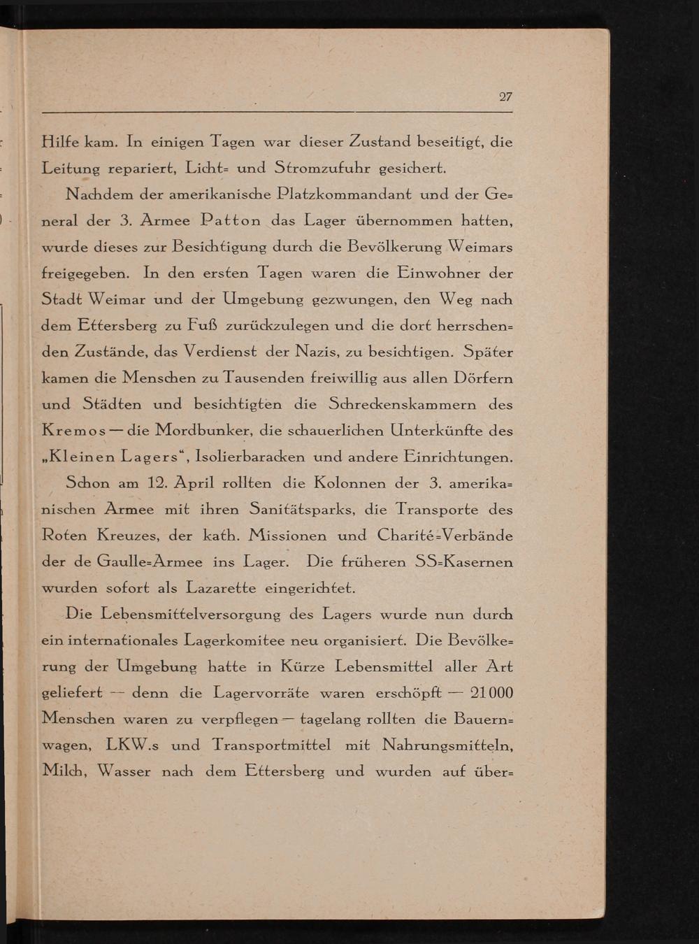 Nachdem der amerikanische Platzkommandant und der General der 3. Armee Patton das Lager übernommen hatten, wurde dieses zur Besichtigung durch die Bevölkerung Weimars freigegeben. In den ersten Tagen waren die Einwohner der Stadt Weimar und der Umgebung gezwungen, den Weg nach dem Ettersberg zu Fuß zurückzulegen und die dort herrschen= den Zustände, das Verdienst der Nazis, zu besichtigen. Später kamen die Menschen zu Tausenden freiwillig aus allen Dörfern und Städten und besichtigten die Schreckenskammern des Kremos die Mordbunker, die schauerlichen Unterkünfte des „ Kleinen Lagers", Isolierbaracken und andere Einrichtungen.