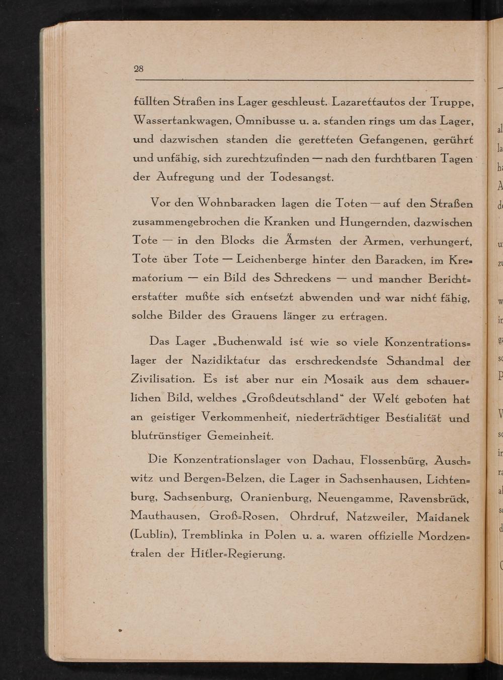 Das Lager„ Buchenwald ist wie so viele Konzentrations= lager der Nazidiktatur das erschreckendste Schandmal der Zivilisation. Es ist aber nur ein Mosaik aus dem schauer= lichen Bild, welches„ Großdeutschland" der Welt geboten hat an geistiger Verkommenheit, niederträchtiger Bestialität und blutrünstiger Gemeinheit.