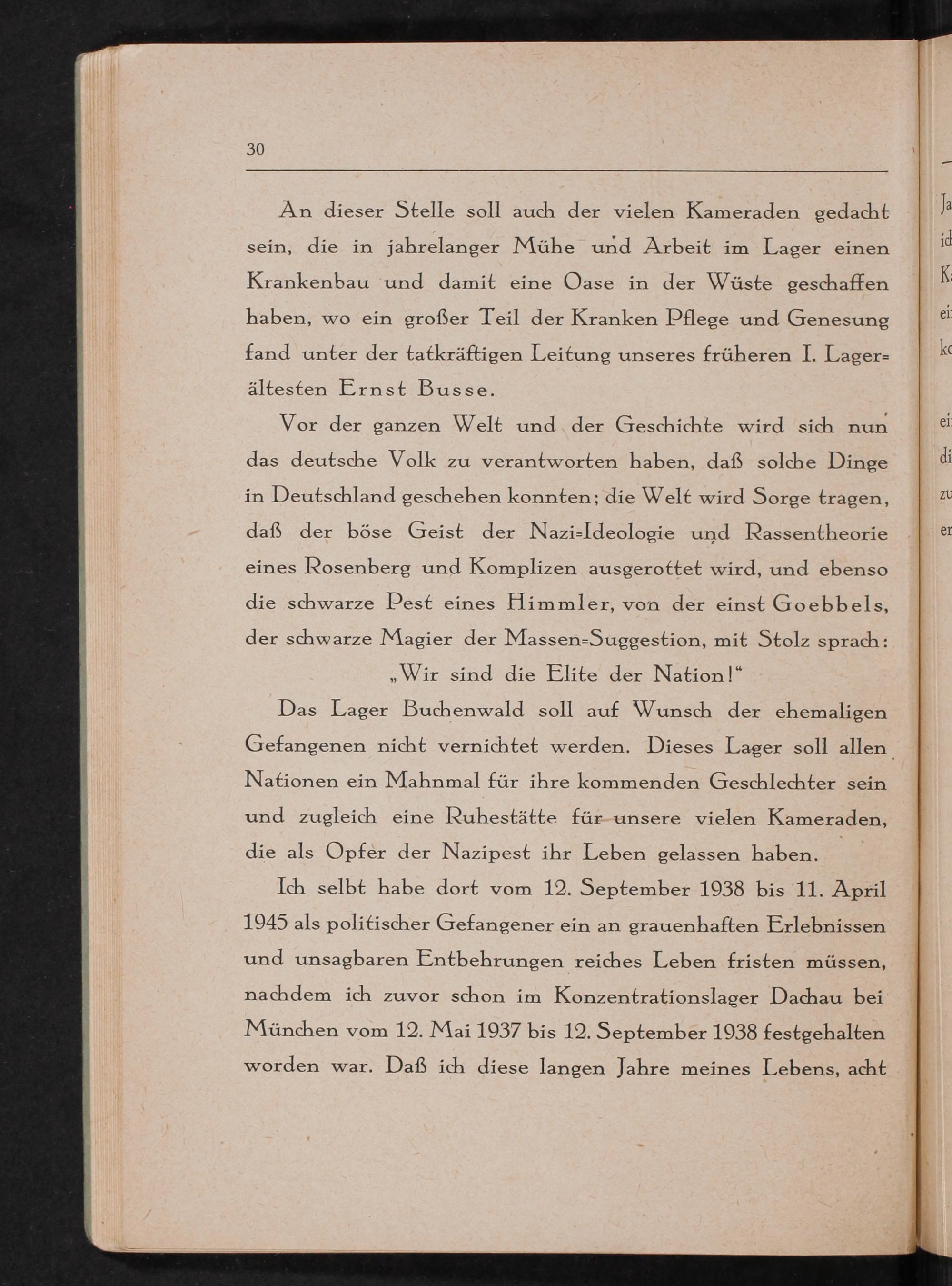 Ich selbt habe dort vom 12. September 1938 bis 11. April 1945 als politischer Gefangener ein an grauenhaften Erlebnissen und unsagbaren Entbehrungen reiches Leben fristen müssen, nachdem ich zuvor schon im Konzentrationslager Dachau bei München vom 12. Mai 1937 bis 12. September 1938 festgehalten