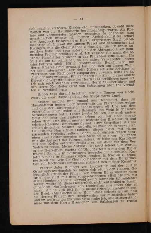 Später meldete mir jemand aus Réchicourt, dass die Haushälterin immer noch ausserhalb des Pfarrhauses wohne und dass der Bürgermeister nachts gegen elf Uhr aus dem Pfarrkeller einen Bidon mit Schnaps und Wein in Flaschen herausgetragen hatte. Dieser freche Mensch, der auch andere Geistliche sehr drangsalierte, bekam von mir einen energischen Brief. Der Bürgermeister schickte den Brief zurück und schrieb folgende Bemerkung darauf:« Ihre Schreibart ist eines echten deutschen Mannes unwürdig, weshalb ich es verweigere, Heil Hitler.» Nun erhielt Dunkern diesen Brief mit einem passenden Begleitschreiben. Schon nach einigen Tagen sprachen zwei Gestapoagenten aus Metz bei mir vor und gaben mir die Antwort des Bürgermeisters. Er habe nur Kartoffeln aus dem Keller entfernt erklärte er, um diese vor dem Verfaulen zu retten. Meine Antwort fiel spottriefend aus: Warum in der Dunkelheit, nachts elf Uhr, Kartoffeln aus dem Keller tragen? Bei uns in Lothringen herrsche der Gebrauch, Kartoffeln nicht in Schnapskrügen, sondern in Körben zu transportieren etc. Wie die Gestapo nachher mit dem Bürgermeister von Réchicourt umsprang, entzieht sich meiner Kenntnis.