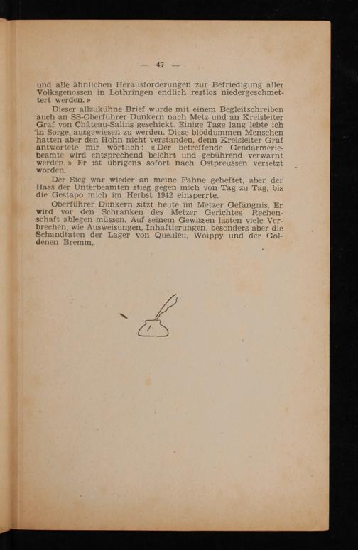 Oberführer Dunkern sitzt heute im Metzer Gefängnis. Er wird vor den Schranken des Metzer Gerichtes Rechen­schaft ablegen müssen. Auf seinem Gewissen lasten viele Ver­brechen, wie Ausweisungen, Inhaftierungen, besonders aber die Schandtaten der Lager von Queuleu, Woippy und der Gol­denen Bremm.