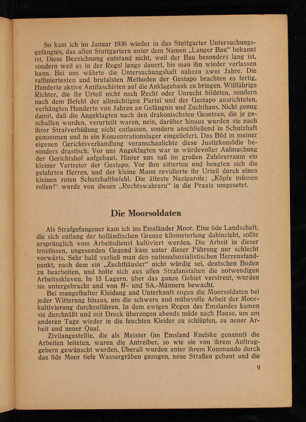 So kam ich im Januar 1936 wieder in das Stuttgarter Untersuchungsgefängnis, das allen Stuttgartern unter dem Namen ,, Langer Bau" bekannt ist. Diese Bezeichnung entstand nicht, weil der Bau besonders lang ist, sondern weil es in der Regel lange dauert, bis man ihn wieder verlassen kann. Bei uns währte die Untersuchungshaft nahezu zwei Jahre. Die raffiniertesten und brutalsten Methoden der Gestapo brachten es fertig, Hunderte aktive Antifaschisten auf die Anklagebank zu bringen. Willfährige Richter, die ihr Urteil nicht nach Recht oder Unrecht bildeten, sondern nach dem Befehl der allmächtigen Partei und der Gestapo ausrichteten, verhängten Hunderte von Jahren an Gefängnis und Zuchthaus . Nicht genug damit, daß die Angeklagten nach den drakonischsten Gesetzen, die je geschaffen wurden, verurteilt waren, nein, darüber hinaus wurden sie nach ihrer Strafverbüßung nicht entlassen, sondern anschließend in Schutzhaft genommen und in ein Konzentrationslager eingeliefert. Das Bild in meiner eigenen Gerichtsverhandlung veranschaulichte diese Justizkomödie besonders drastisch. Vor uns Angeklagten war in würdevoller Aufmachung der Gerichtshof aufgebaut. Hinter uns saß im großen Zuhörerraum ein kleiner Vertreter der Gestapo . Vor ihm zitterten und beugten sich die gelahrten Herren, und der kleine Mann revidierte ihr Urteil durch einen kleinen roten Schutzhaftbefehl. Die älteste Naziparole:„ Köpfe müssen rollen!" wurde von diesen ,, Rechtswahrern" in die Praxis umgesetzt.