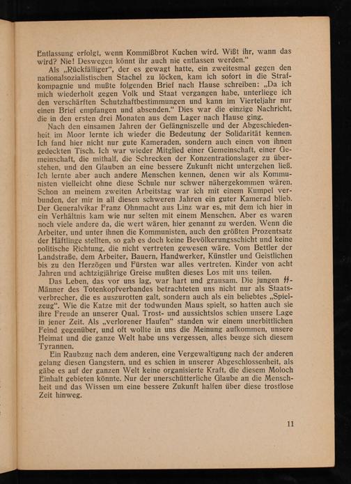 Nach den einsamen Jahren der Gefängniszelle und der Abgeschiedenheit im Moor lernte ich wieder die Bedeutung der Solidarität kennen. Ich fand hier nicht nur gute Kameraden, sondern auch einen von ihnen gedeckten Tisch. Ich war wieder Mitglied einer Gemeinschaft, einer Gemeinschaft, die mithalf, die Schrecken der Konzentrationslager zu überstehen, und den Glauben an eine bessere Zukunft nicht untergehen ließ. Ich lernte aber auch andere Menschen kennen, denen wir als Kommunisten vielleicht ohne diese Schule nur schwer nähergekommen wären. Schon an meinem zweiten Arbeitstag war ich mit einem Kumpel verbunden, der mir in all diesen schweren Jahren ein guter Kamerad blieb. Der Generalvikar Franz Ohnmacht aus Linz war es, mit dem ich hier in ein Verhältnis kam wie nur selten mit einem Menschen. Aber es waren noch viele andere da, die wert wären, hier genannt zu werden. Wenn die Arbeiter, und unter ihnen die Kommunisten, auch den größten Prozentsatz der Häftlinge stellten, so gab es doch keine Bevölkerungsschicht und keine politische Richtung, die nicht vertreten gewesen wäre. Vom Bettler der Landstraße, dem Arbeiter, Bauern, Handwerker, Künstler und Geistlichen bis zu den Herzögen und Fürsten war alles vertreten. Kinder von acht Jahren und achtzigjährige Greise mußten dieses Los mit uns teilen.