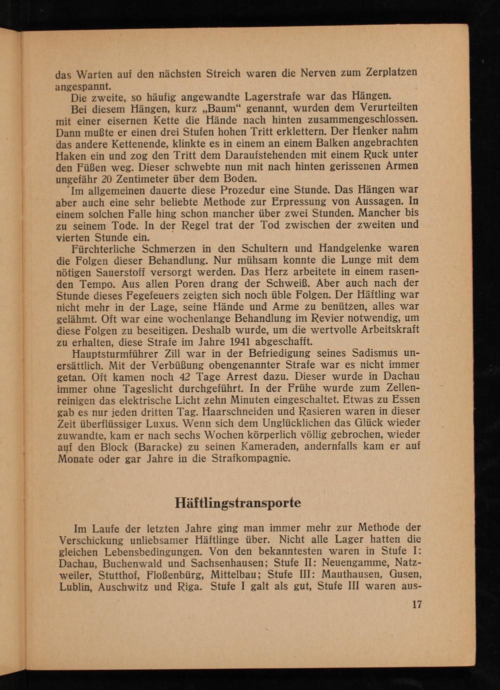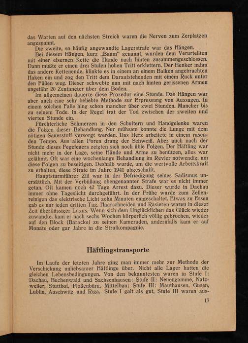 Fürchterliche Schmerzen in den Schultern und Handgelenke waren die Folgen dieser Behandlung. Nur mühsam konnte die Lunge mit dem nötigen Sauerstoff versorgt werden. Das Herz arbeitete in einem rasenden Tempo. Aus allen Poren drang der Schweiß. Aber auch nach der Stunde dieses Fegefeuers zeigten sich noch üble Folgen. Der Häftling war nicht mehr in der Lage, seine Hände und Arme zu benützen, alles war gelähmt. Oft war eine wochenlange Behandlung im Revier notwendig, um diese Folgen zu beseitigen. Deshalb wurde, um die wertvolle Arbeitskraft zu erhalten, diese Strafe im Jahre 1941 abgeschafft.