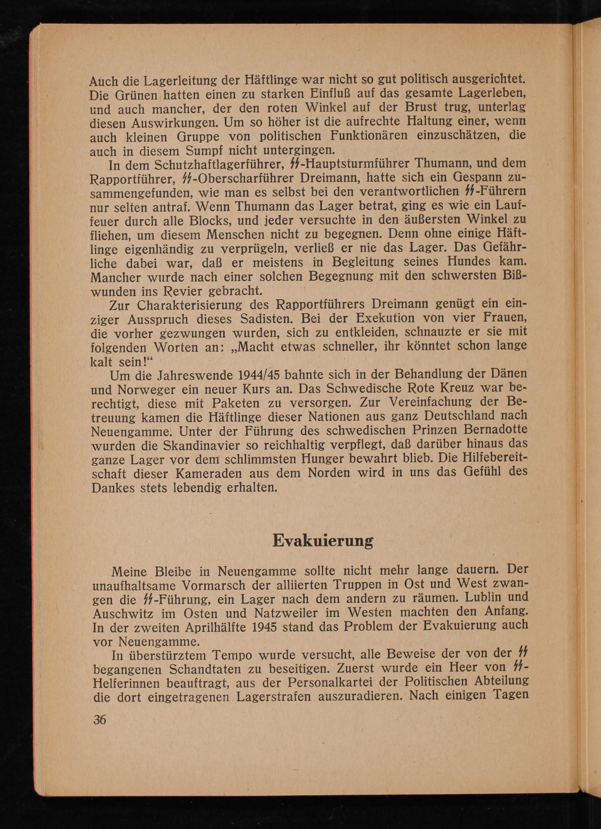 In dem Schutzhaftlagerführer, 1½- Hauptsturmführer Thumann, und dem Rapportführer, ½½- Oberscharführer Dreimann, hatte sich ein Gespann zusammengefunden, wie man es selbst bei den verantwortlichen-Führern nur selten antraf. Wenn Thumann das Lager betrat, ging es wie ein Lauffeuer durch alle Blocks, und jeder versuchte in den äußersten Winkel zu fliehen, um diesem Menschen nicht zu begegnen. Denn ohne einige Häftlinge eigenhändig zu verprügeln, verließ er nie das Lager. Das Gefährliche dabei war, daß er meistens in Begleitung seines Hundes kam. Mancher wurde nach einer solchen Begegnung mit den schwersten Biẞwunden ins Revier gebracht.