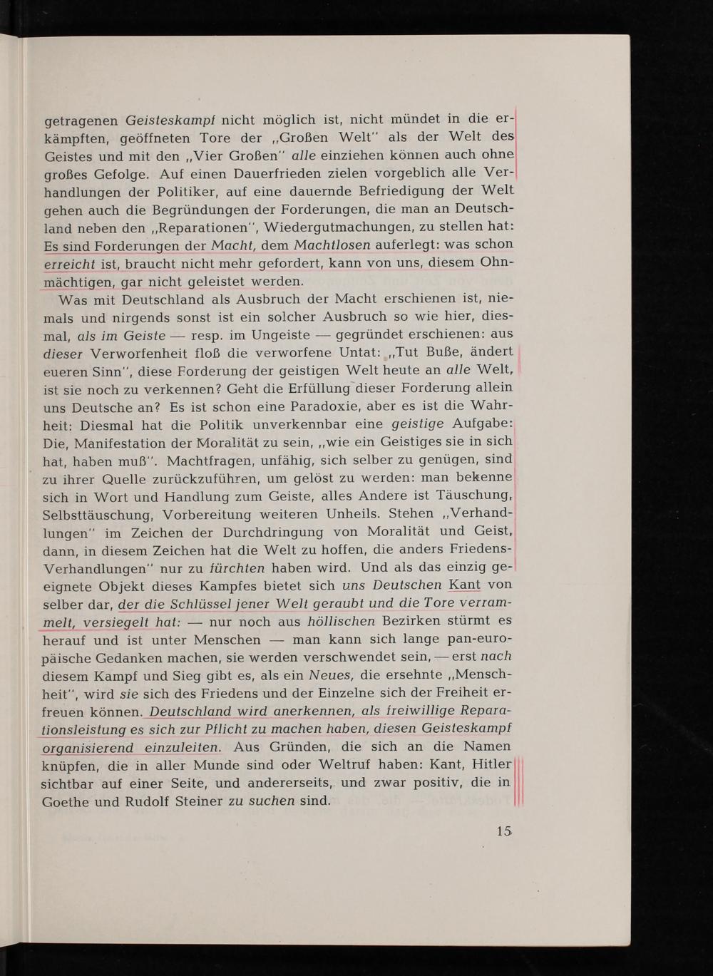Was mit Deutschland als Ausbruch der Macht erschienen ist, niemals und nirgends sonst ist ein solcher Ausbruch so wie hier, diesmal, als im Geiste. resp. im Ungeiste- gegründet erschienen: aus dieser Verworfenheit floß die verworfene Untat: ,, Tut Buße, ändert eueren Sinn", diese Forderung der geistigen Welt heute an alle Welt, ist sie noch zu verkennen? Geht die Erfüllung dieser Forderung allein uns Deutsche an? Es ist schon eine Paradoxie, aber es ist die Wahrheit: Diesmal hat die Politik unverkennbar eine geistige Aufgabe: Die, Manifestation der Moralität zu sein ,,, wie ein Geistiges sie in sich hat, haben muß". Machtfragen, unfähig, sich selber zu genügen, sind zu ihrer Quelle zurückzuführen, um gelöst zu werden: man bekenne sich in Wort und Handlung zum Geiste, alles Andere ist Täuschung, Selbsttäuschung, Vorbereitung weiteren Unheils. Stehen ,, Verhandlungen" im Zeichen der Durchdringung von Moralität und Geist, dann, in diesem Zeichen hat die Welt zu hoffen, die anders FriedensVerhandlungen" nur zu fürchten haben wird. Und als das einzig geeignete Objekt dieses Kampfes bietet sich uns Deutschen Kant von selber dar, der die Schlüssel jener Welt geraubt und die Tore verrammelt, versiegelt hat: nur noch aus höllischen Bezirken stürmt es herauf und ist unter Menschen man kann sich lange pan- europäische Gedanken machen, sie werden verschwendet sein, erst nach diesem Kampf und Sieg gibt es, als ein Neues, die ersehnte ,, Menschheit ", wird sie sich des Friedens und der Einzelne sich der Freiheit erfreuen können. Deutschland wird anerkennen, als freiwillige Reparationsleistung es sich zur Pflicht zu machen haben, diesen Geisteskampf organisierend einzuleiten. Aus Gründen, die sich an die Namen knüpfen, die in aller Munde sind oder Weltruf haben: Kant, Hitler sichtbar auf einer Seite, und andererseits, und zwar positiv, die in Goethe und Rudolf Steiner zu suchen sind.