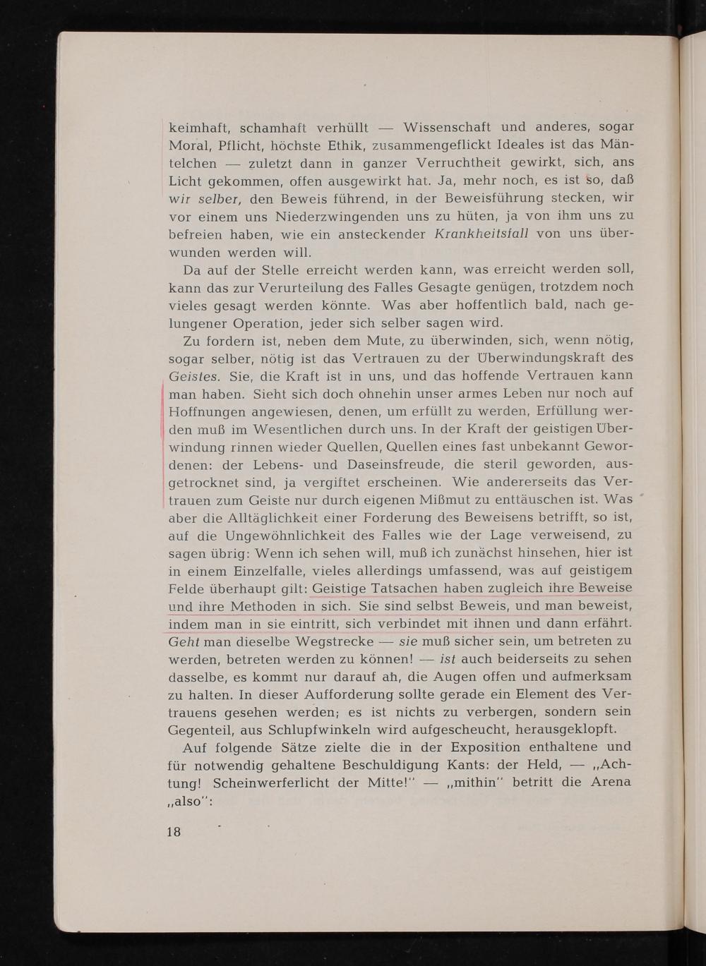 Zu fordern ist, neben dem Mute, zu überwinden, sich, wenn nötig, sogar selber, nötig ist das Vertrauen zu der Überwindungskraft des Geistes. Sie, die Kraft ist in uns, und das hoffende Vertrauen kann man haben. Sieht sich doch ohnehin unser armes Leben nur noch auf Hoffnungen angewiesen, denen, um erfüllt zu werden, Erfüllung werden muß im Wesentlichen durch uns. In der Kraft der geistigen Überwindung rinnen wieder Quellen, Quellen eines fast unbekannt Gewordenen: der Lebens- und Daseinsfreude, die steril geworden, ausgetrocknet sind, ja vergiftet erscheinen. Wie andererseits das Vertrauen zum Geiste nur durch eigenen Mißmut zu enttäuschen ist. Was aber die Alltäglichkeit einer Forderung des Beweisens betrifft, so ist, auf die Ungewöhnlichkeit des Falles wie der Lage verweisend, zu sagen übrig: Wenn ich sehen will, muß ich zunächst hinsehen, hier ist in einem Einzelfalle, vieles allerdings umfassend, was auf geistigem Felde überhaupt gilt: Geistige Tatsachen haben zugleich ihre Beweise und ihre Methoden in sich. Sie sind selbst Beweis, und man beweist, indem man in sie eintritt, sich verbindet mit ihnen und dann erfährt. Geht man dieselbe Wegstrecke sie muß sicher sein, um betreten zu werden, betreten werden zu können! ist auch beiderseits zu sehen dasselbe, es kommt nur darauf ah, die Augen offen und aufmerksam zu halten. In dieser Aufforderung sollte gerade ein Element des Vertrauens gesehen werden; es ist nichts zu verbergen, sondern sein Gegenteil, aus Schlupfwinkeln wird aufgescheucht, herausgeklopft. Auf folgende Sätze zielte die in der Exposition enthaltene und für notwendig gehaltene Beschuldigung Kants: der Held ,,, Achtung! Scheinwerferlicht der Mitte!"- ,, mithin" betritt die Arena ,, also":
