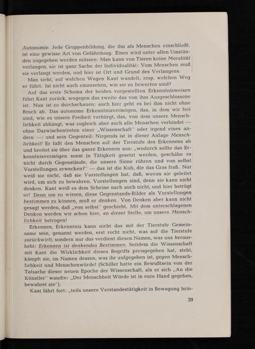 Erkennen, Erkenntnis kann nicht das mit der Tierstufe Gemein- same sein, genannt werden, erst recht nicht, was auf die Tierstufe zurückwirft, sondern nur das verdient diesen Namen, was uns heraus- hebt: Erkennen ist denkendes Bestimmen. Seitdem die Wissenschaft mit Kant die Wirklichkeit dieses Begriffs preisgegeben hat, steht, kämpft sie, im Namen dessen, was ihr aufgegeben ist, gegen Mensch- lichkeit und Menschenwürde!(Schiller hatte ein Bewußtsein von der Tatsache dieser neuen Epoche der Wissenschaft, als er sich„An die Künstler‘' wandte:„Der Menschheit Würde ist in eure Hand gegeben, bewahret sie‘).