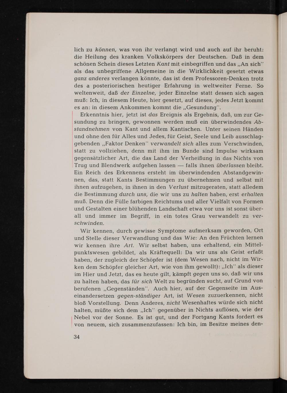 lich zu können, was von ihr verlangt wird und auch auf ihr beruht: die Heilung des kranken Volkskörpers der Deutschen . Daß in dem schönen Schein dieses Letzten Kant mit einbegriffen und das ,, An sich" als das unbegriffene Allgemeine in die Wirklichkeit gesetzt etwas ganz anderes verlangen könnte, das ist dem Professoren- Denken trotz des a posteriorischen heutiger Erfahrung in weltweiter Ferne. So weltenweit, daß der Einzelne, jeder Einzelne statt dessen sich sagen muẞ: Ich, in diesem Heute, hier gesetzt, auf dieses, jedes Jetzt kommt es an: in diesem Ankommen kommt die ,, Gesundung".