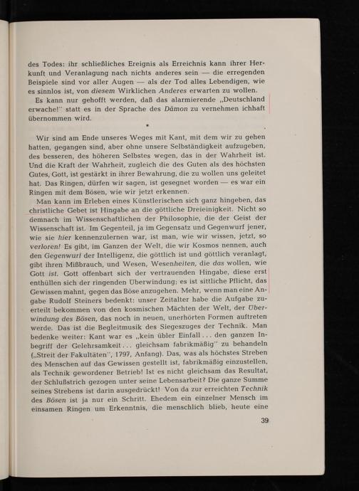 Man kann im Erleben eines Künstlerischen sich ganz hingeben, das christliche Gebet ist Hingabe an die göttliche Dreieinigkeit. Nicht so demnach im Wissenschaftlichen der Philosophie, die der Geist der Wissenschaft ist. Im Gegenteil, ja im Gegensatz und Gegenwurf jener, wie sie hier kennenzulernen war, ist man, wie wir wissen, jetzt, so verloren! Es gibt, im Ganzen der Welt, die wir Kosmos nennen, auch den Gegenwurf der Intelligenz, die göttlich ist und göttlich veranlagt, gibt ihren Mißbrauch, und Wesen, Wesenheiten, die das wollen, wie Gott ist. Gott offenbart sich der vertrauenden Hingabe, diese erst enthüllen sich der ringenden Überwindung; es ist sittliche Pflicht, das Gewissen mahnt, gegen das Böse anzugehen. Mehr, wenn man eine An-| gabe Rudolf Steiners bedenkt: unser Zeitalter habe die Aufgabe zu- erteilt bekommen von den kosmischen Mächten der Welt, der Über- windung des Bösen, das noch in neuen, unerhörten Formen auftreten werde. Das ist die Begleitmusik des Siegeszuges der Technik. Man bedenke weiter: Kant war es„kein übler Einfall... den ganzen In- begriff der Gelehrsamkeit... gleichsam fabrikmäßig’ zu behandeln („Streit der Fakultäten ”, 1797, Anfang). Das, was als höchstes Streben des Menschen auf das Gewissen gestellt ist, fabrikmäßig einzustellen, als Technik gewordener Betrieb! Ist es nicht gleichsam das Resultat, der Schlußstrich gezogen unter seine Lebensarbeit? Die ganze Summe seines Strebens ist darin ausgedrückt! Von da zur erreichten Technik des Bösen ist ja nur ein Schritt. Ehedem ein einzelner Mensch im einsamen Ringen um Erkenntnis, die menschlich blieb, heute eine