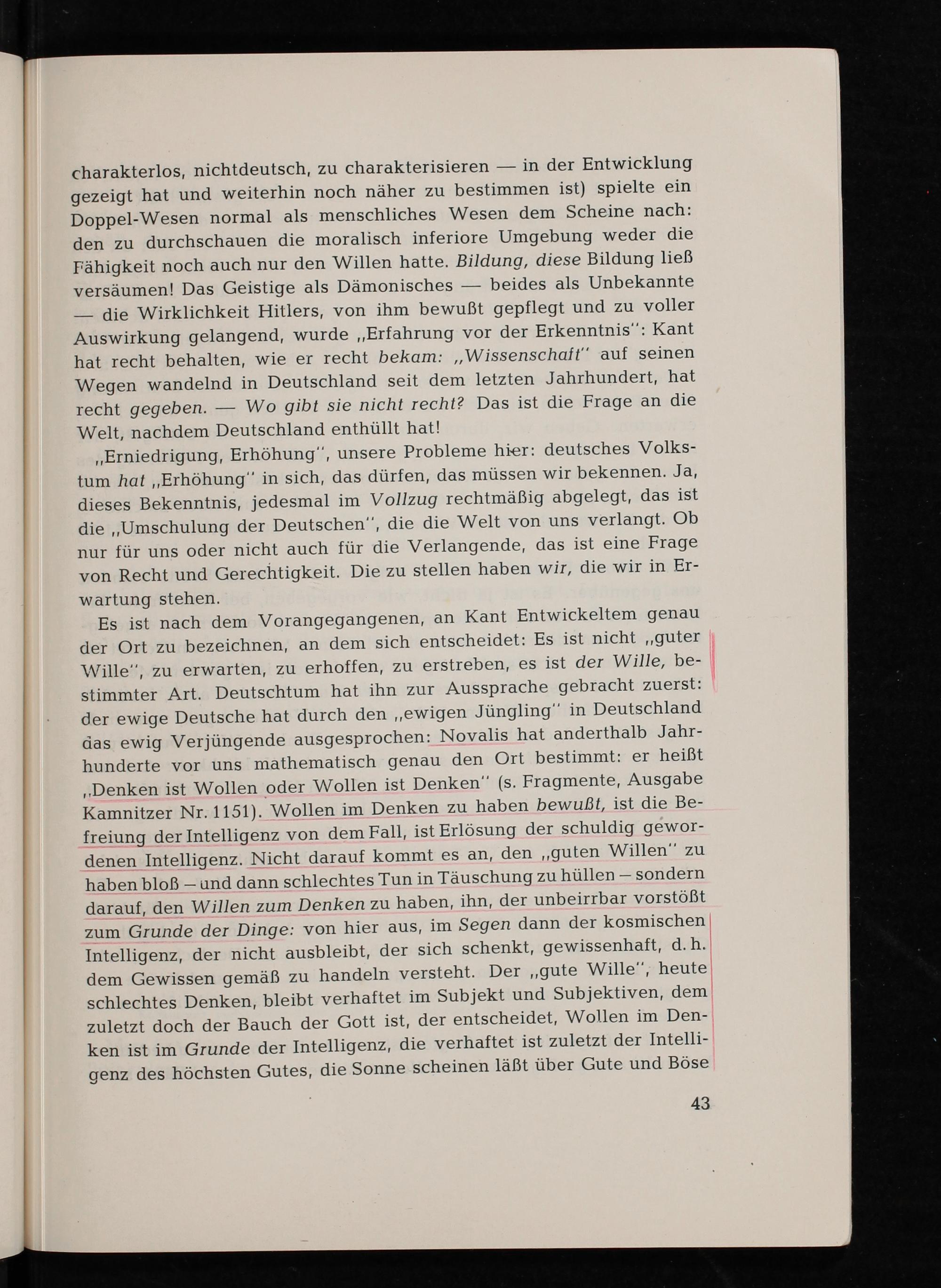 Es ist nach dem Vorangegangenen, an Kant Entwickeltem genau der Ort zu bezeichnen, an dem sich entscheidet: Es ist nicht ,, guter Wille", zu erwarten, zu erhoffen, zu erstreben, es ist der Wille, bestimmter Art. Deutschtum hat ihn zur Aussprache gebracht zuerst: der ewige Deutsche hat durch den ,, ewigen Jüngling" in Deutschland das ewig Verjüngende ausgesprochen: Novalis hat anderthalb Jahrhunderte vor uns mathematisch genau den Ort bestimmt: er heißt ,, Denken ist Wollen oder Wollen ist Denken"( s. Fragmente, Ausgabe Kamnitzer Nr. 1151). Wollen im Denken zu haben bewußt, ist die Befreiung der Intelligenz von dem Fall, ist Erlösung der schuldig gewordenen Intelligenz. Nicht darauf kommt es an, den ,, guten Willen" zu haben bloß- und dann schlechtes Tun in Täuschung zu hüllen- sondern darauf, den Willen zum Denken zu haben, ihn, der unbeirrbar vorstößt zum Grunde der Dinge: von hier aus, im Segen dann der kosmischen Intelligenz, der nicht ausbleibt, der sich schenkt, gewissenhaft, d. h. dem Gewissen gemäß zu handeln versteht. Der gute Wille", heute schlechtes Denken, bleibt verhaftet im Subjekt und Subjektiven, dem zuletzt doch der Bauch der Gott ist, der entscheidet, Wollen im Denken ist im Grunde der Intelligenz, die verhaftet ist zuletzt der Intelligenz des höchsten Gutes, die Sonne scheinen läßt über Gute und Böse