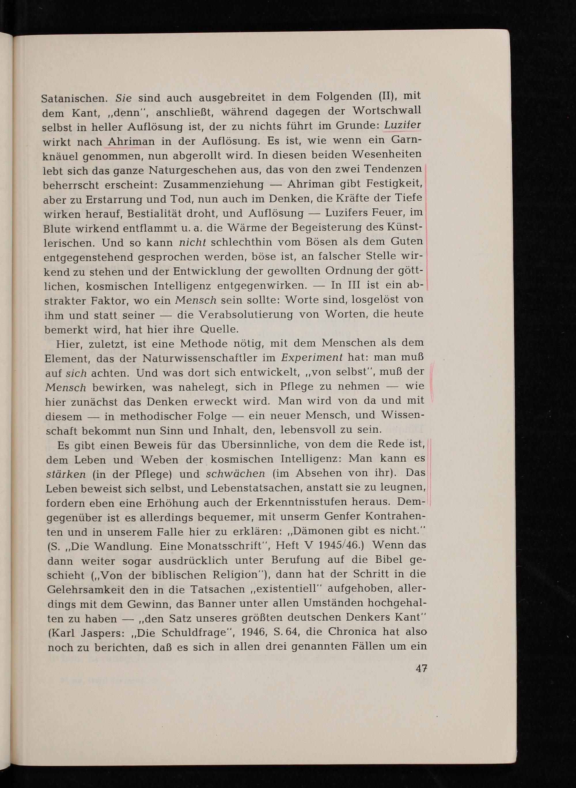 Es gibt einen Beweis für das Übersinnliche, von dem die Rede ist, dem Leben und Weben der kosmischen Intelligenz: Man kann es stärken( in der Pflege) und schwächen( im Absehen von ihr). Das Leben beweist sich selbst, und Lebenstatsachen, anstatt sie zu leugnen, fordern eben eine Erhöhung auch der Erkenntnisstufen heraus. Demgegenüber ist es allerdings bequemer, mit unserm Genfer Kontrahenten und in unserem Falle hier zu erklären: ,, Dämonen gibt es nicht." ( S. ,, Die Wandlung. Eine Monatsschrift", Heft V 1945/46.) Wenn das dann weiter sogar ausdrücklich unter Berufung auf die Bibel geschieht( ,, Von der biblischen Religion"), dann hat der Schritt in die Gelehrsamkeit den in die Tatsachen ,, existentiell" aufgehoben, allerdings mit dem Gewinn, das Banner unter allen Umständen hochgehalten zu haben ,, den Satz unseres größten deutschen Denkers Kant " ( Karl Jaspers : ,, Die Schuldfrage", 1946, S. 64, die Chronica hat also noch zu berichten, daß es sich in allen drei genannten Fällen um ein